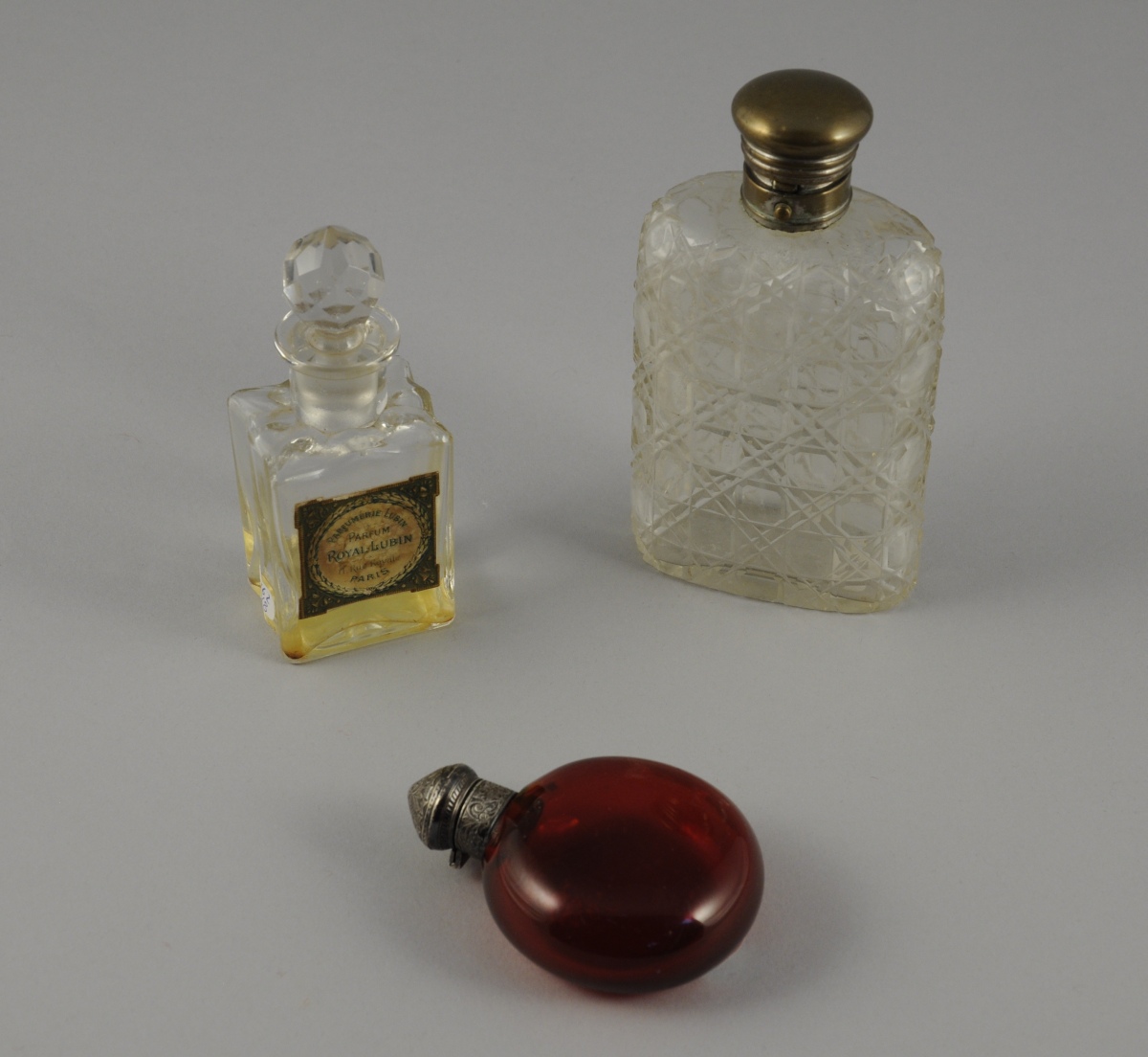 -Le premier à panse applatie de forme circulaire en verre rouge. Monture en argent ciselée de rinceaux feuillagés. Grande-Bretagne, début du XXème. Haut. 8, Diam. 5,5 cm.