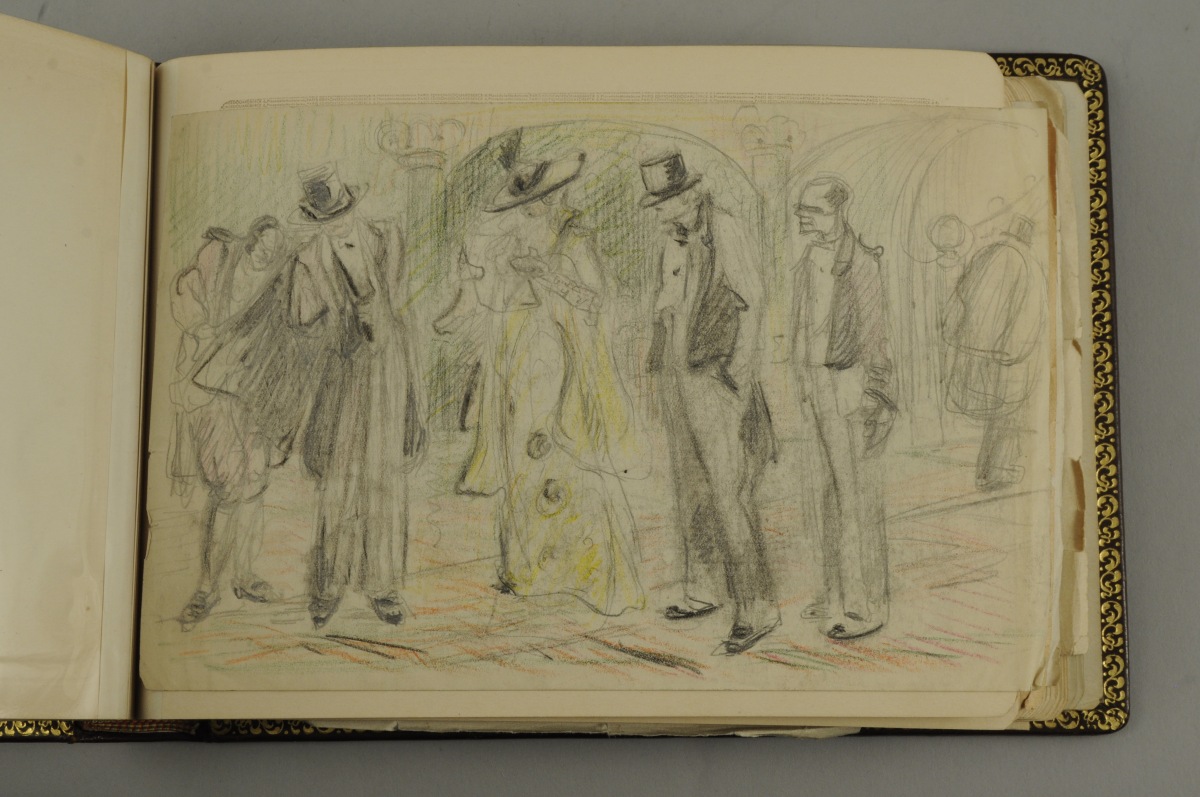 Dessins, croquis encre ou graphite, sur papier de couleurs, rehauts couleurs - 22 feuilles collées dans un album plein cuir bordeaux, aux armes de la Ville de Paris. Tranches dorées. Annotations, recherches et précisions manuscrites par le général Tanguy.
