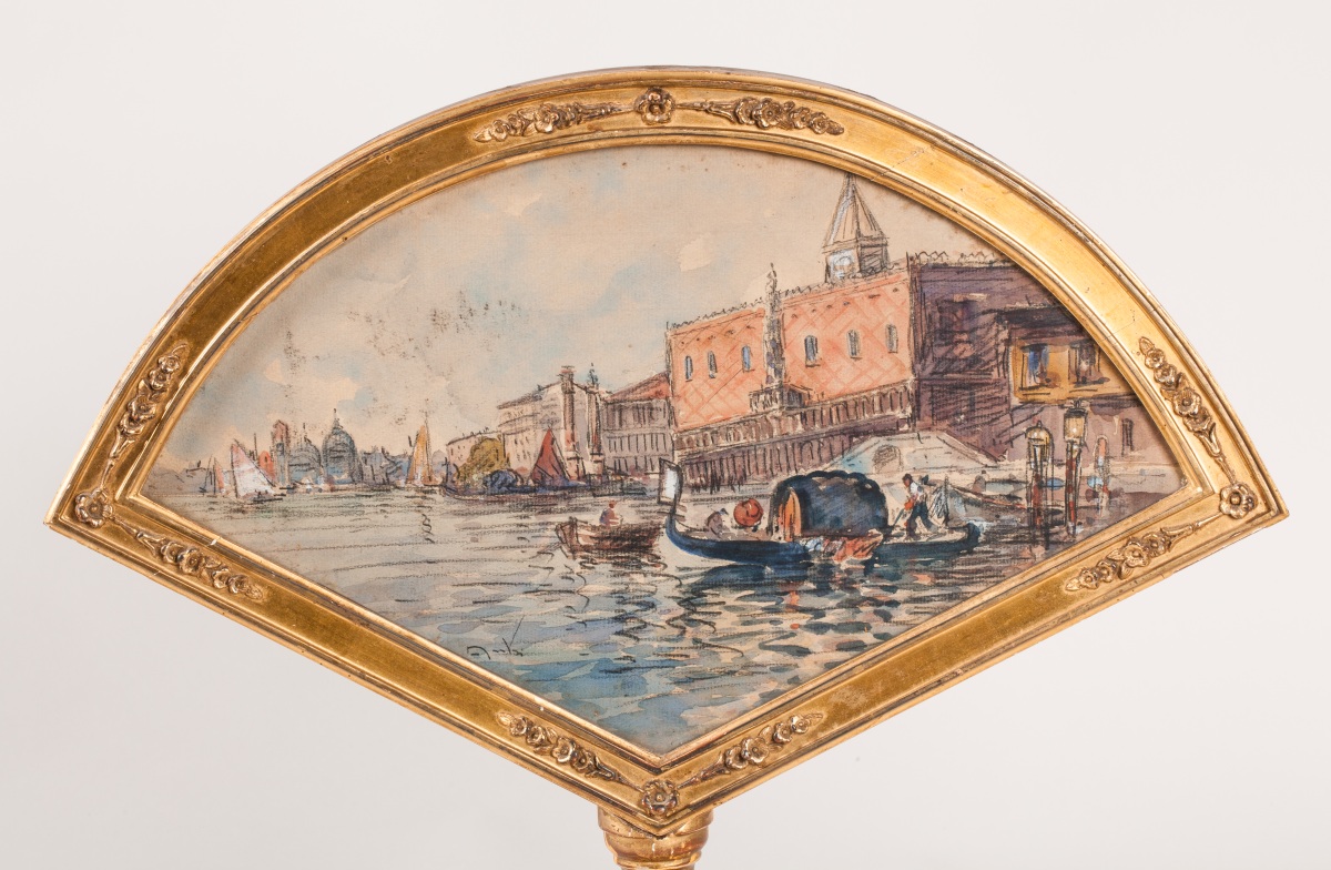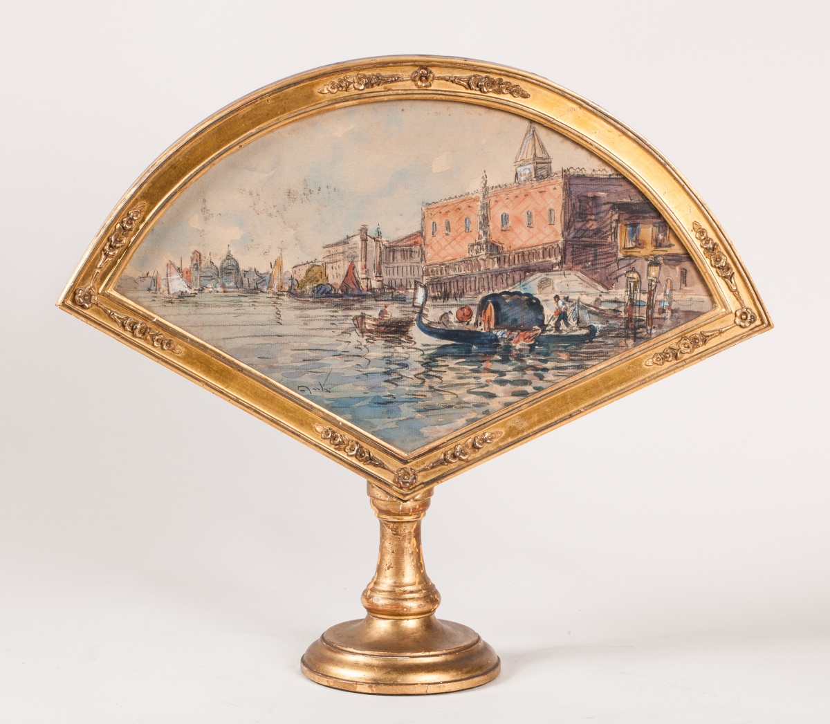 Riche CADRE PRÉSENTOIR en forme d'éventail en bois sculpté et doré sur piédouche. Orné de guirlandes de fleurs. Fin XIXe. Haut. 39 cm. Larg. 44 cm.