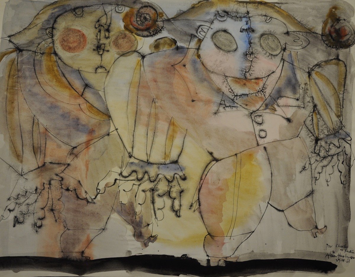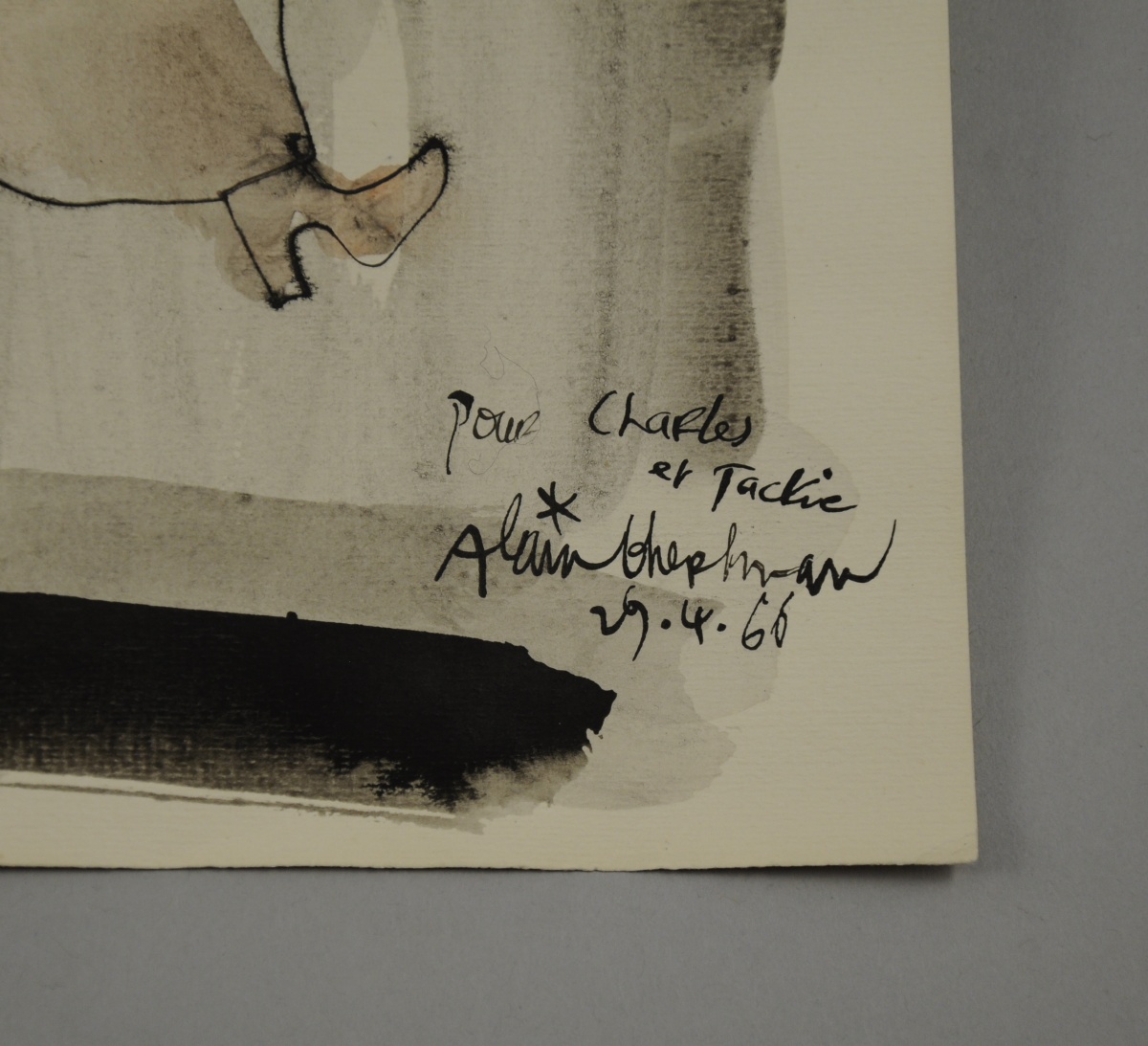 Dessin à l'encre aquarellé, signé en bas à droite, daté 29.4.66, "pour Charles et Jackie" (Feld).