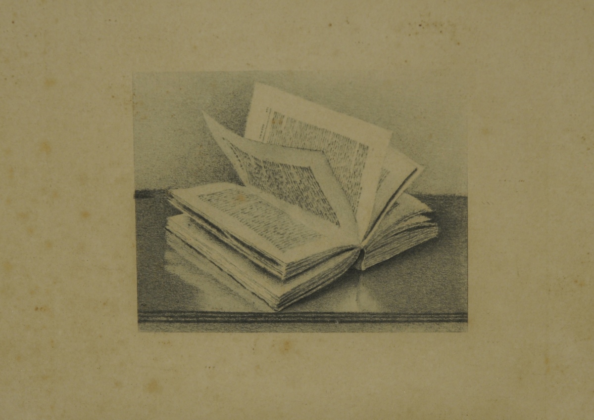 -Livre ouvert. Lithographie. 6,5 x 8,5 cm.