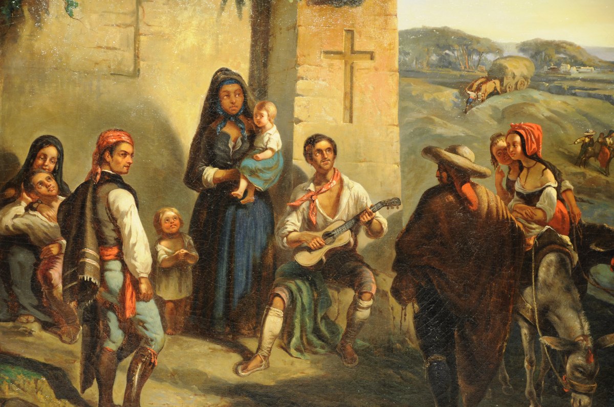 Réunion de Gitans devant une église.