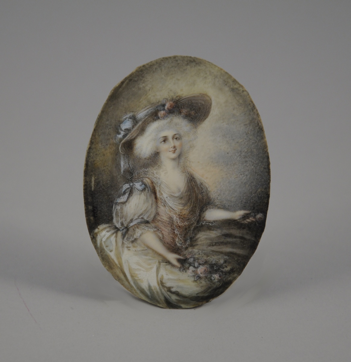 MINIATURE ovale en ivoire ornée d'un portrait de femme au large chapeau.