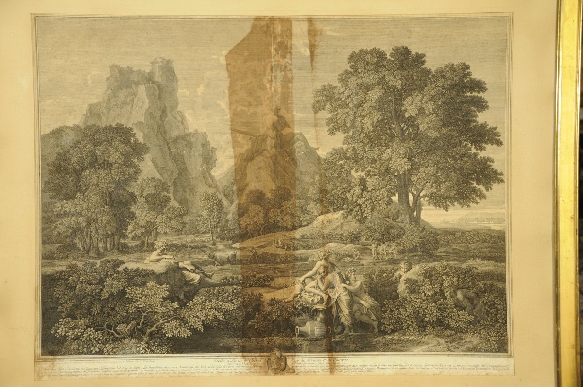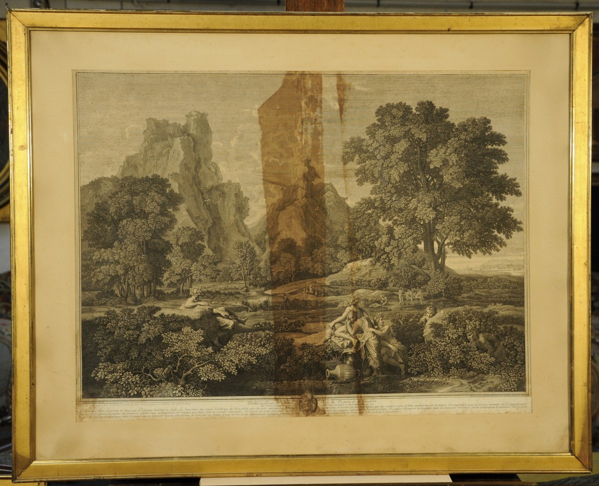 PAIRE de gravures : "Paysage avec Polyphème" et "Orphée et Eurydice" d'après Nicolas Poussin. 57 x 75 cm.
