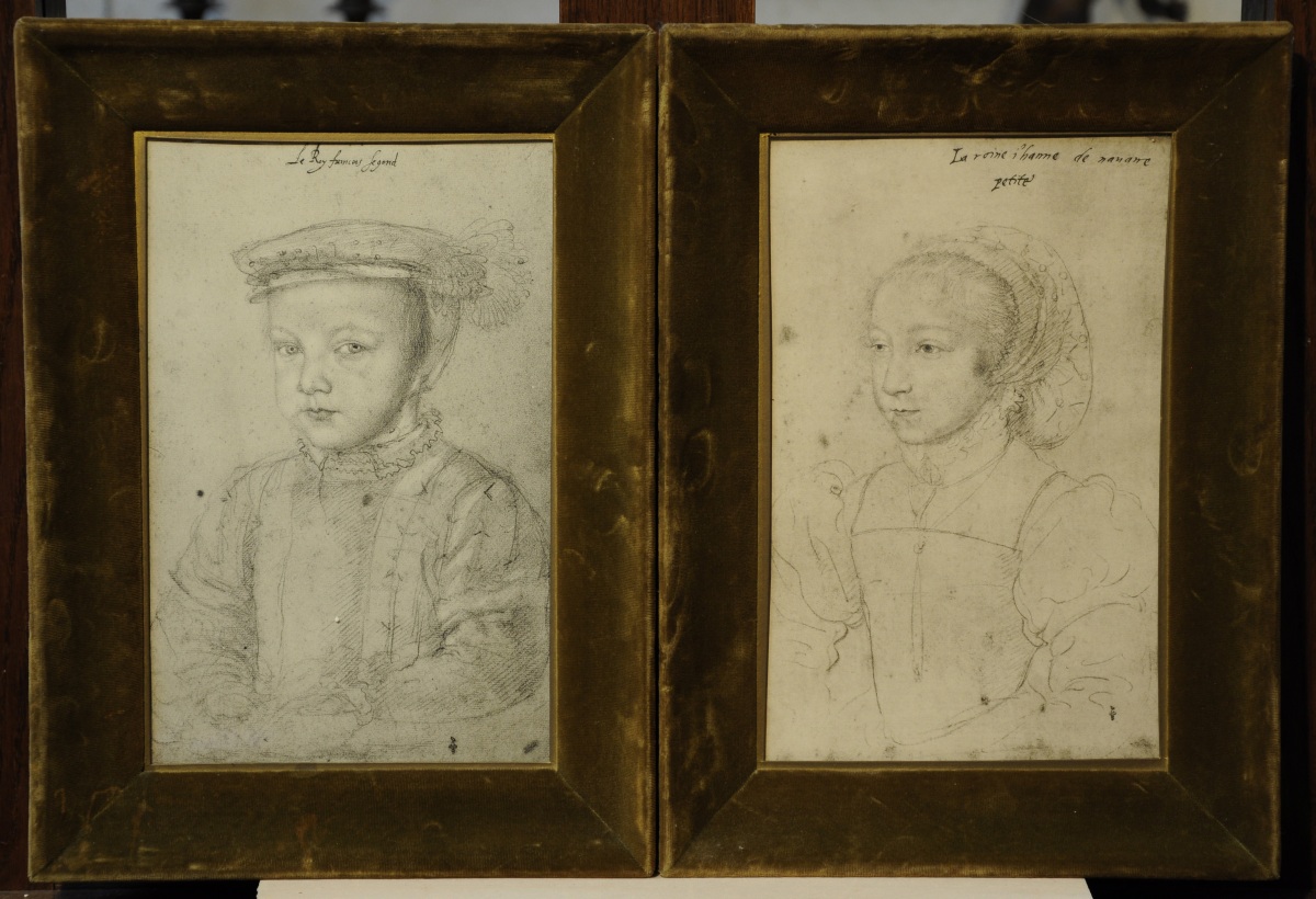 - "Le Roy François Second" et "La reine Jhanne de Navarre petite", d'après François Clouet, DEUX - PROCÉDÉS, XXème. 31 x 20 cm. ;