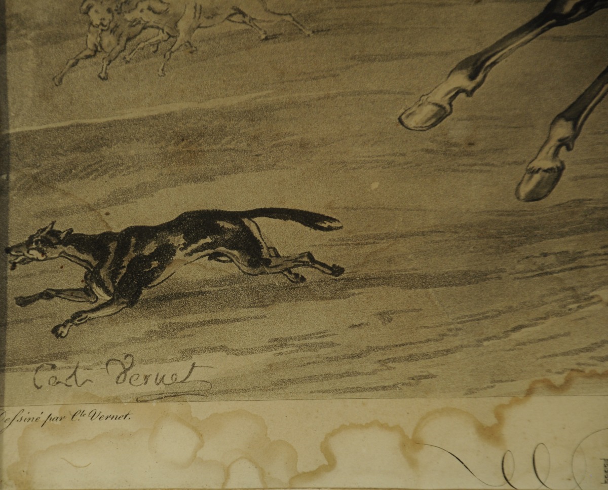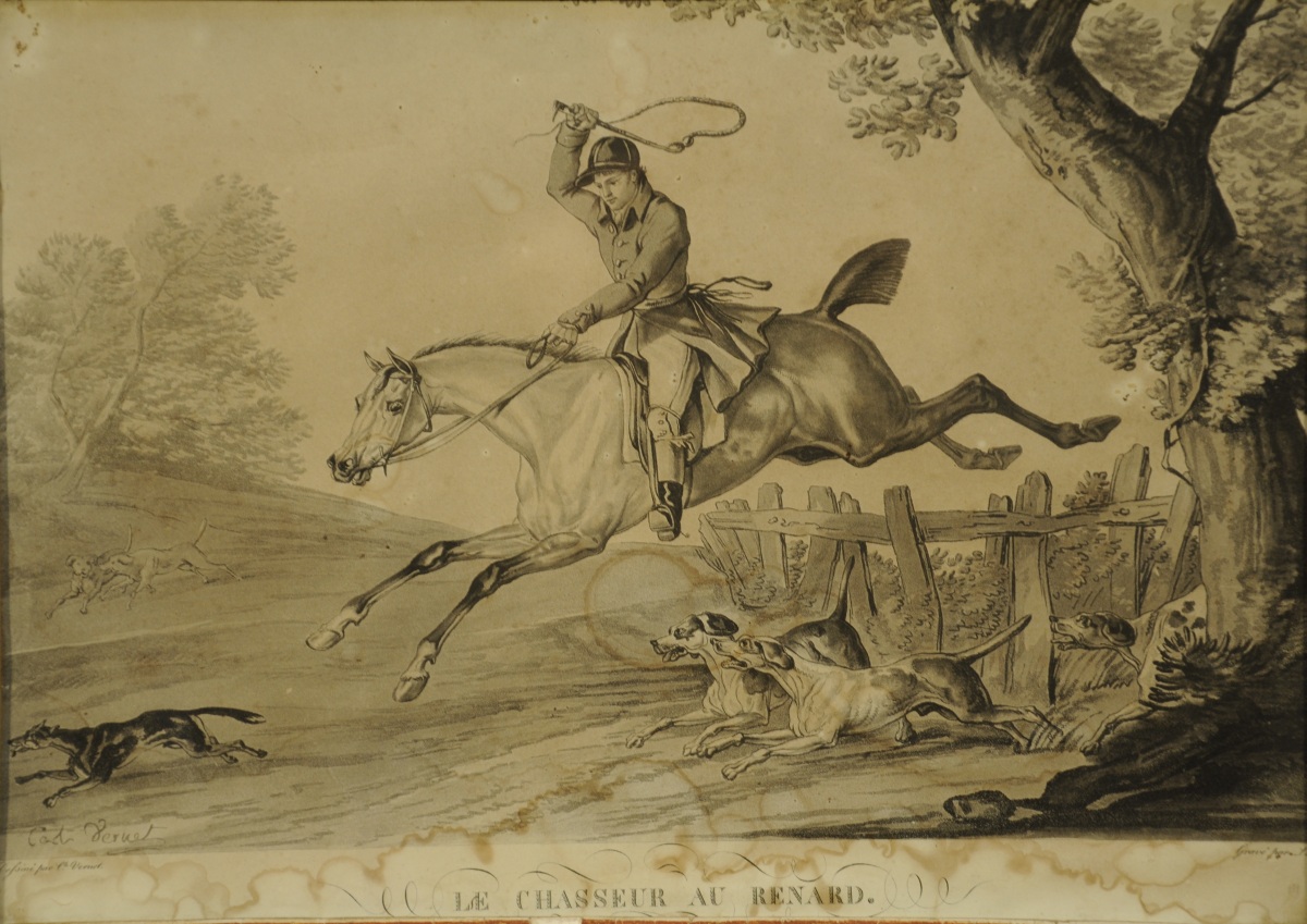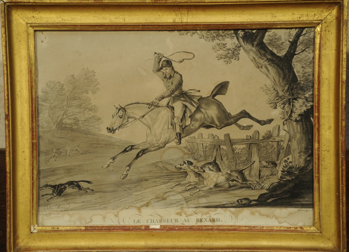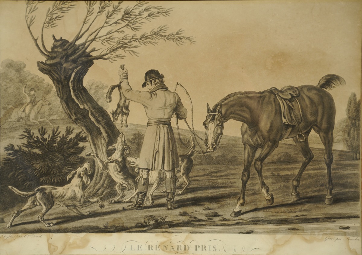 - D'après Carl VERNET et gravé par Levachez. Deux scènes de chasse au renard. 36 x 47 cm. (humidité, manques aux cadres).