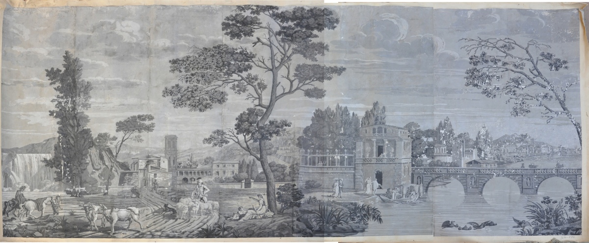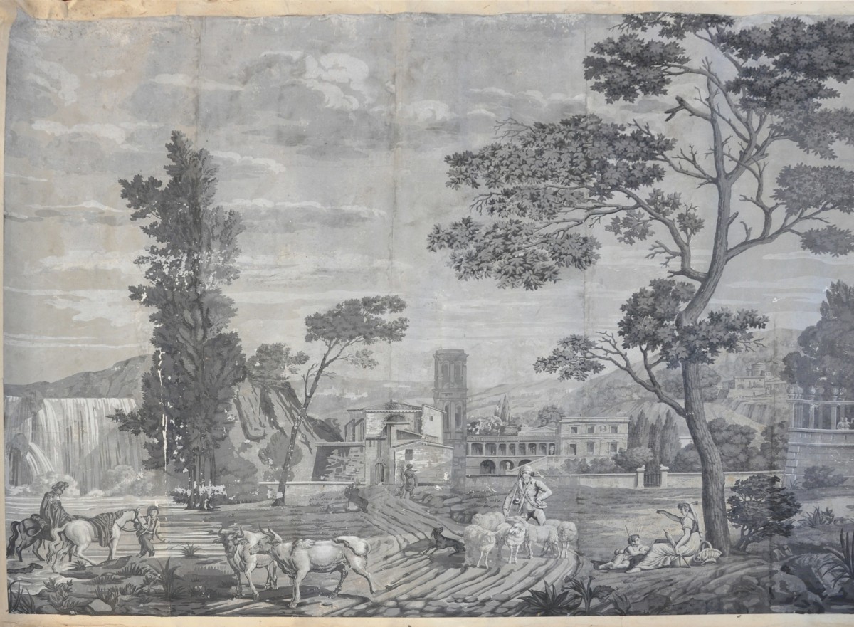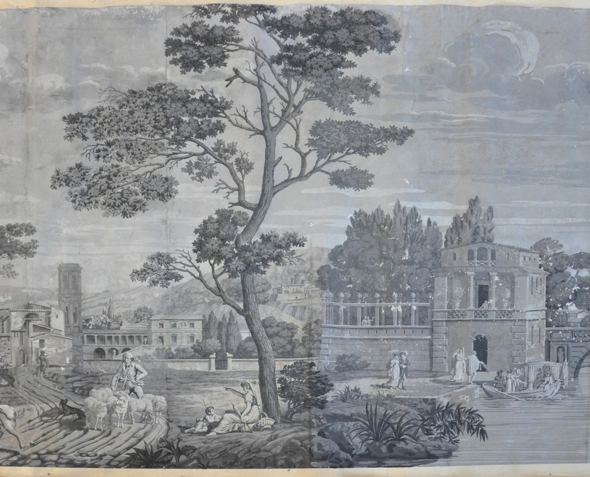 PAPIER PEINT panoramique en grisaille. Il comprend 7 lés.