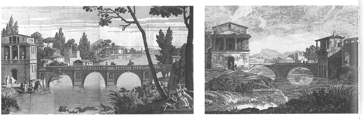 Lés 27-29 : Évocation du Ponte Rotto (?) avec une réinterprétation du "Pélerinage à l'île de Cythère" d'Antoine Watteau pour le départ en bateau. La maison du lé 27 provient de la gravure n°9 de Constant Bourgeois, "Vue de l'entrée d'un petit bourg près de Florence".