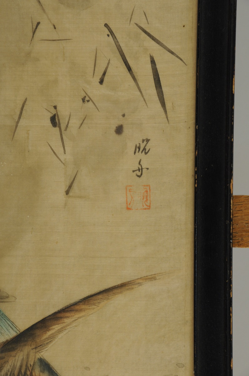 PEINTURE sur soie figurant deux faisans. Cachet rouge au centre à gauche.