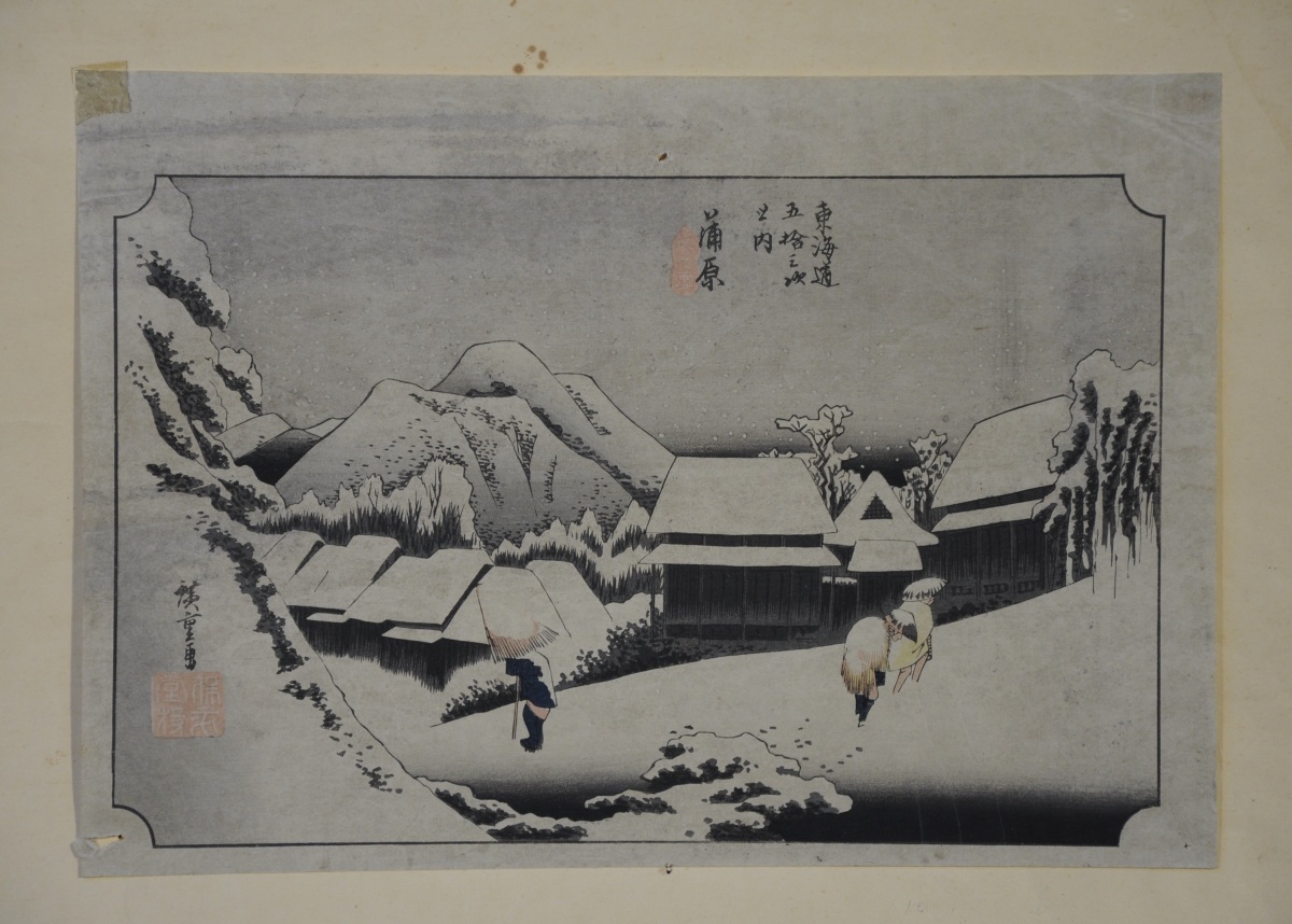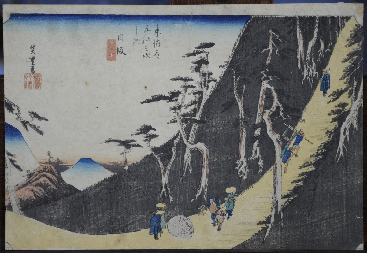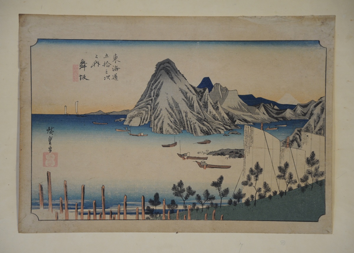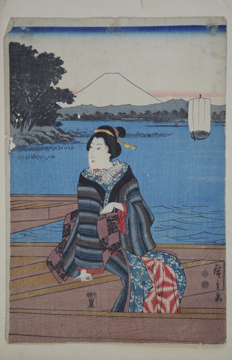 Un oban tate-e, partie de triptyque, représentant une jeune femme sur un bateau et un oban yoko-e de la série du Tokaido.
