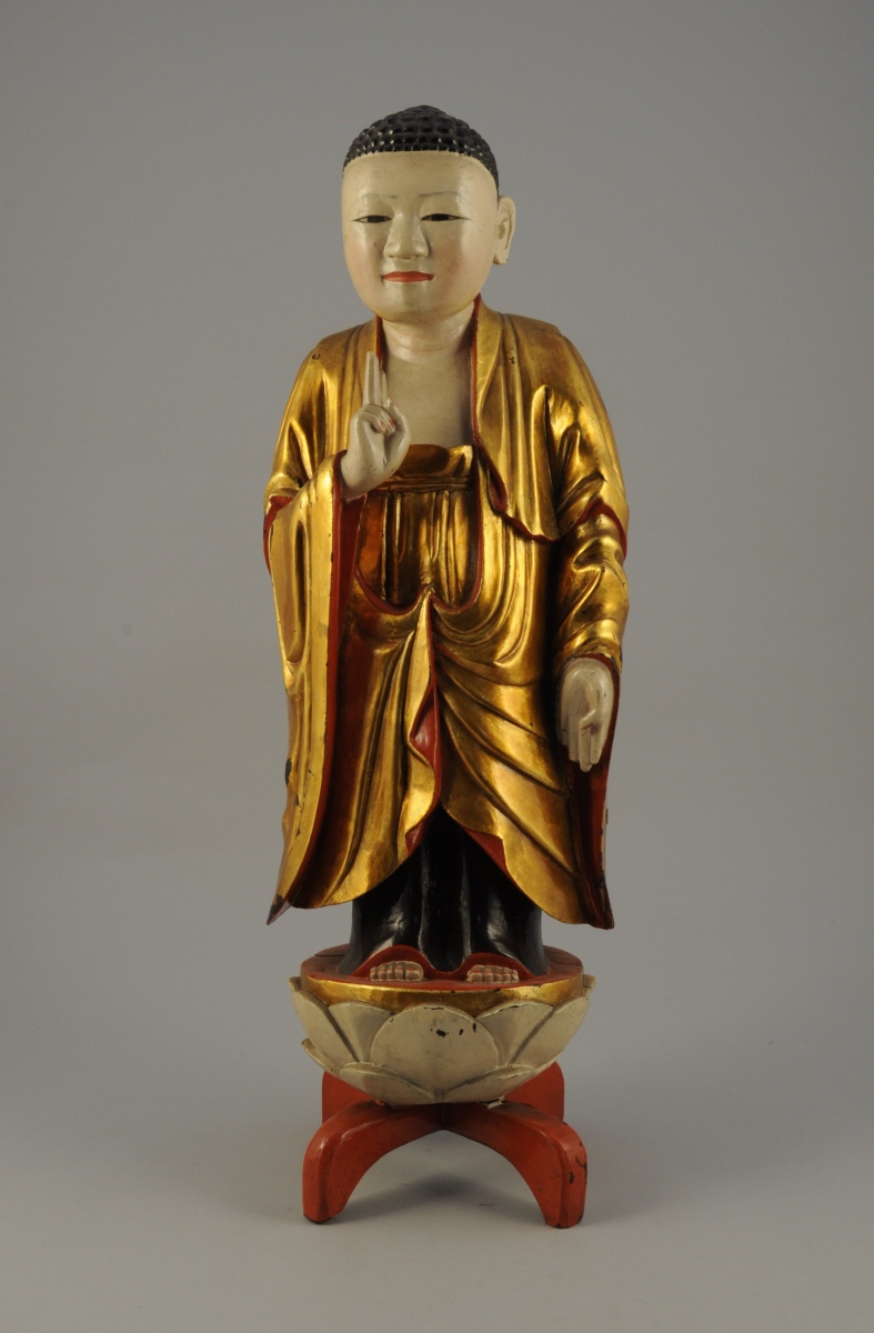 MOINE TAOÏSTE en bois laqué et doré sur socle lotus.