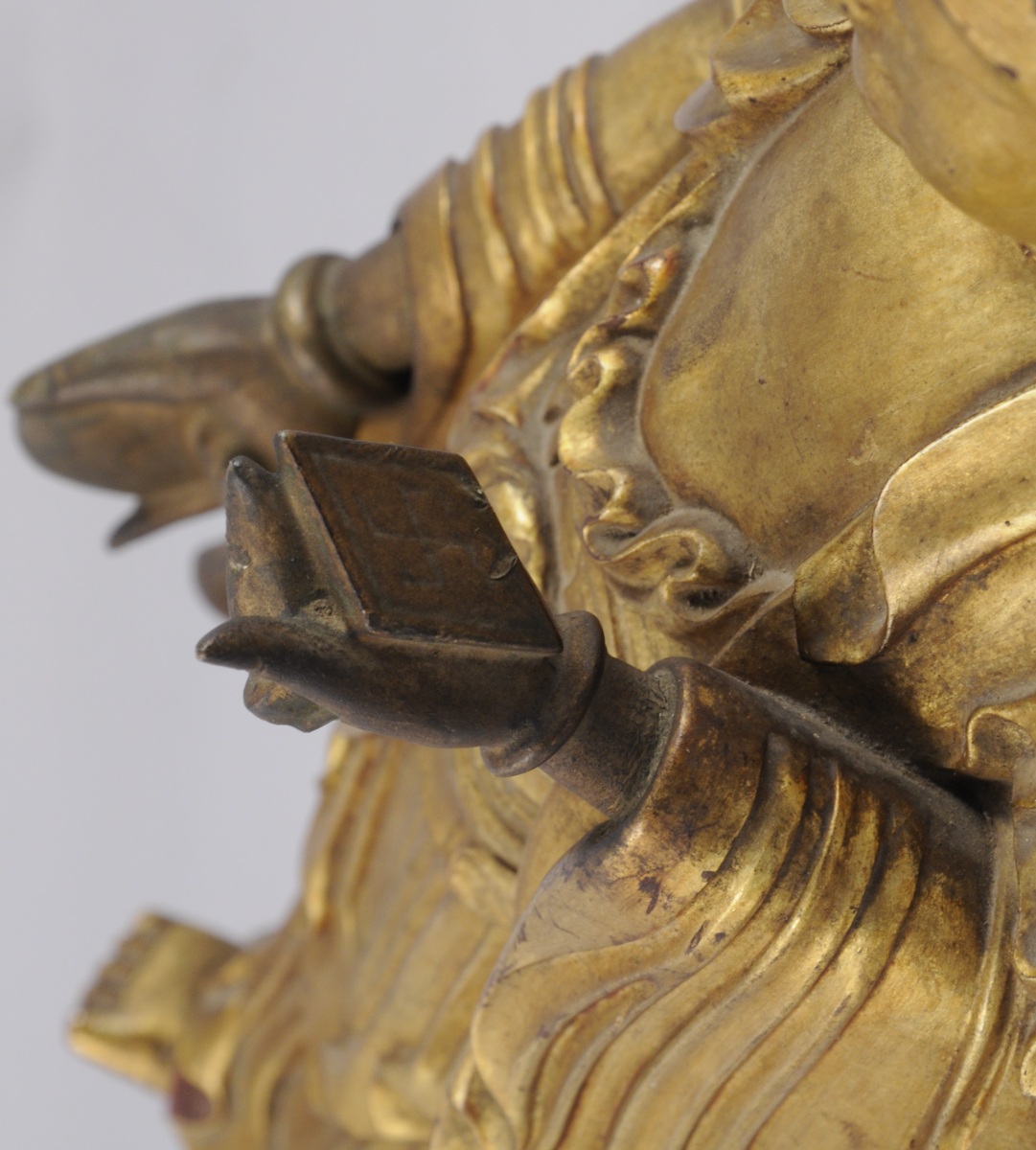 BOUDDHA en position debout en bois sculpté et doré. Il tient dans la main gauche un objet de forme losangique sculpté d'une swastika.