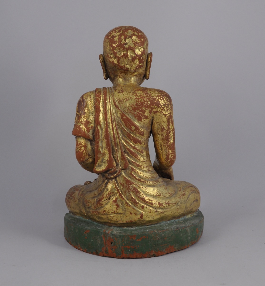 BOUDDHA en bois sculpté et doré assis en tailleur, une main à plat, l'autre en position d'offrande.