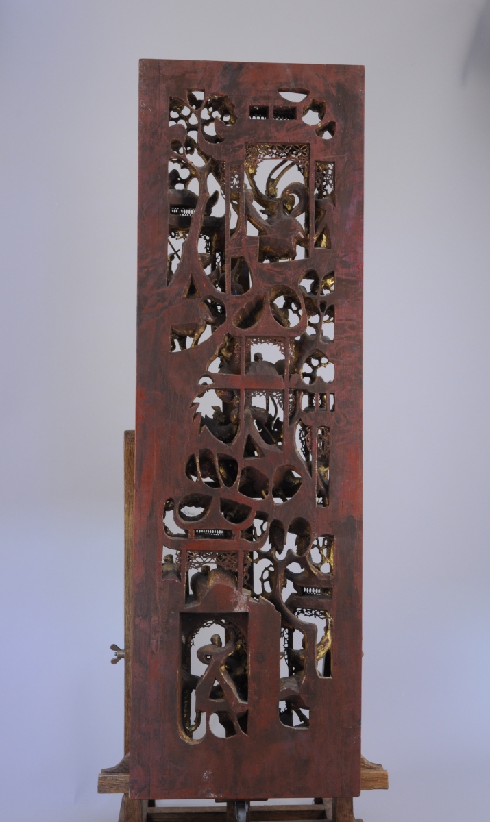 PANNEAU en bois sculpté et doré représentant des guerriers à pied et à cheval dans un décor architecturé et arboré.