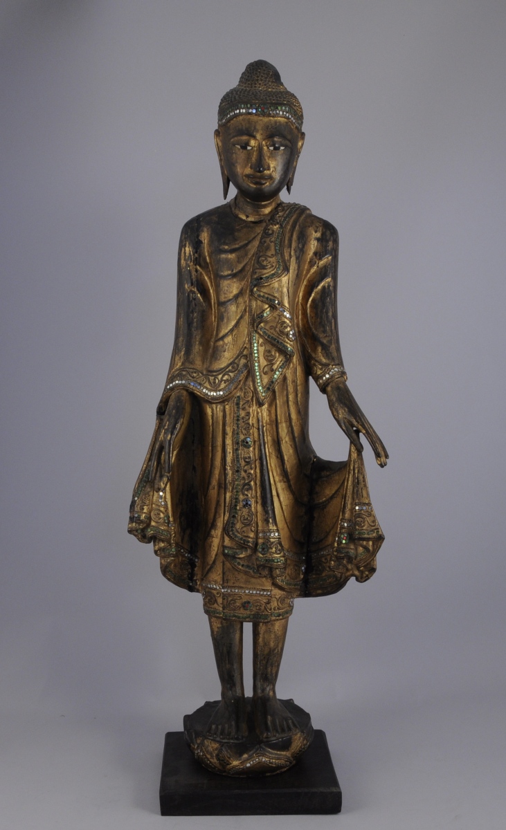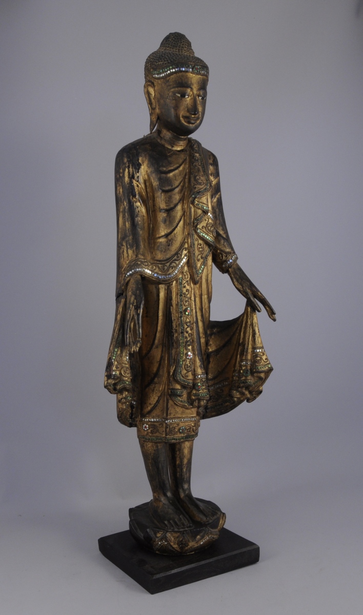 BOUDDHA en position debout, les bras le long du corps, en bois sculpté, doré et incrusté de fragments de miroir. Il est vêtu d'un long manteau.