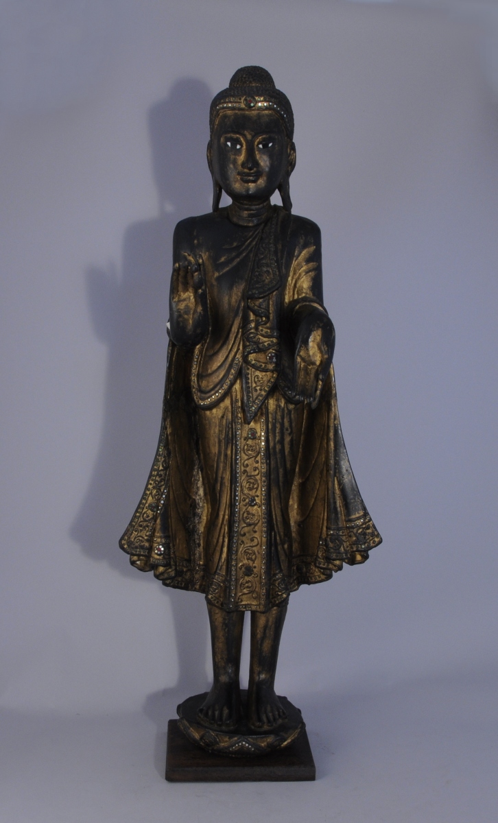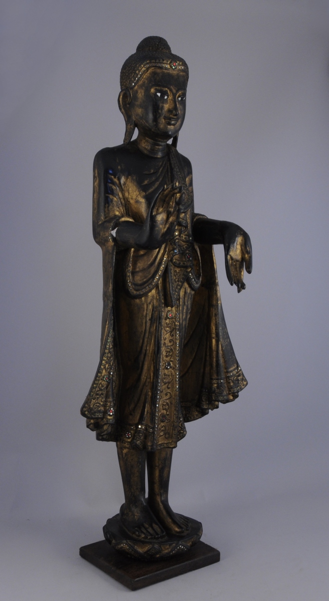 BOUDDHA en position debout, la paume des mains tournée vers l'extérieur, en bois sculpté, doré et incrusté de fragments de miroir.