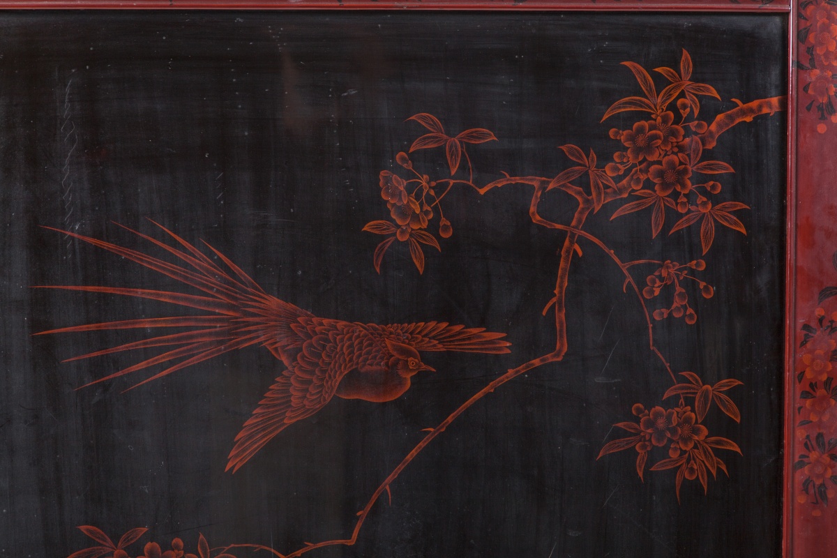 PARAVENT à deux feuilles en bois laqué noir et rouge. Décor "rapaces et dragons" en incrustation d'ivoire, os, nacre et bois sculpté. Au revers, décor en rouge d'oiseaux dans des branchages.
