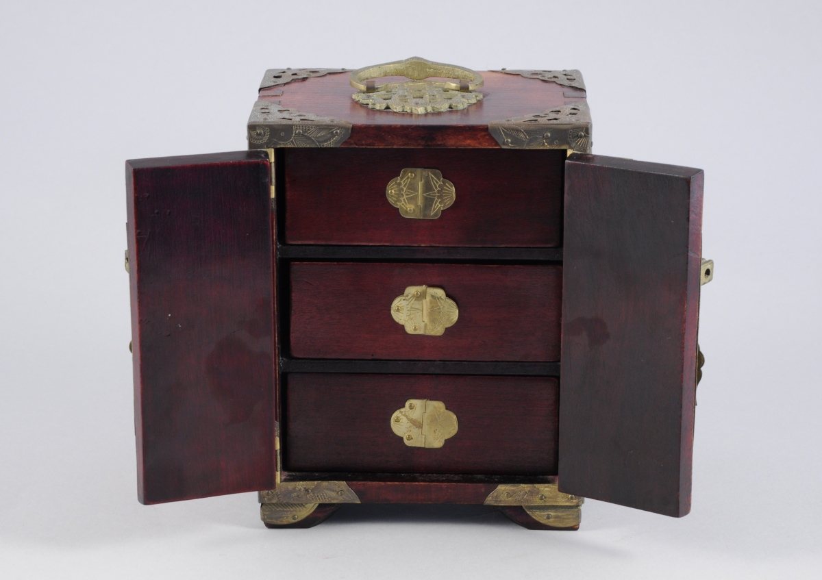 COFFRET-CABINET de forme rectangulaire en bois teinté. Il ouvre en façade par deux vantaux découvrant trois tiroirs. Les vantaux et les côtés ornés d'une plaque en serpentine sculptée et ajourée d'une plante fleurie. enforts en laiton ouvragé.