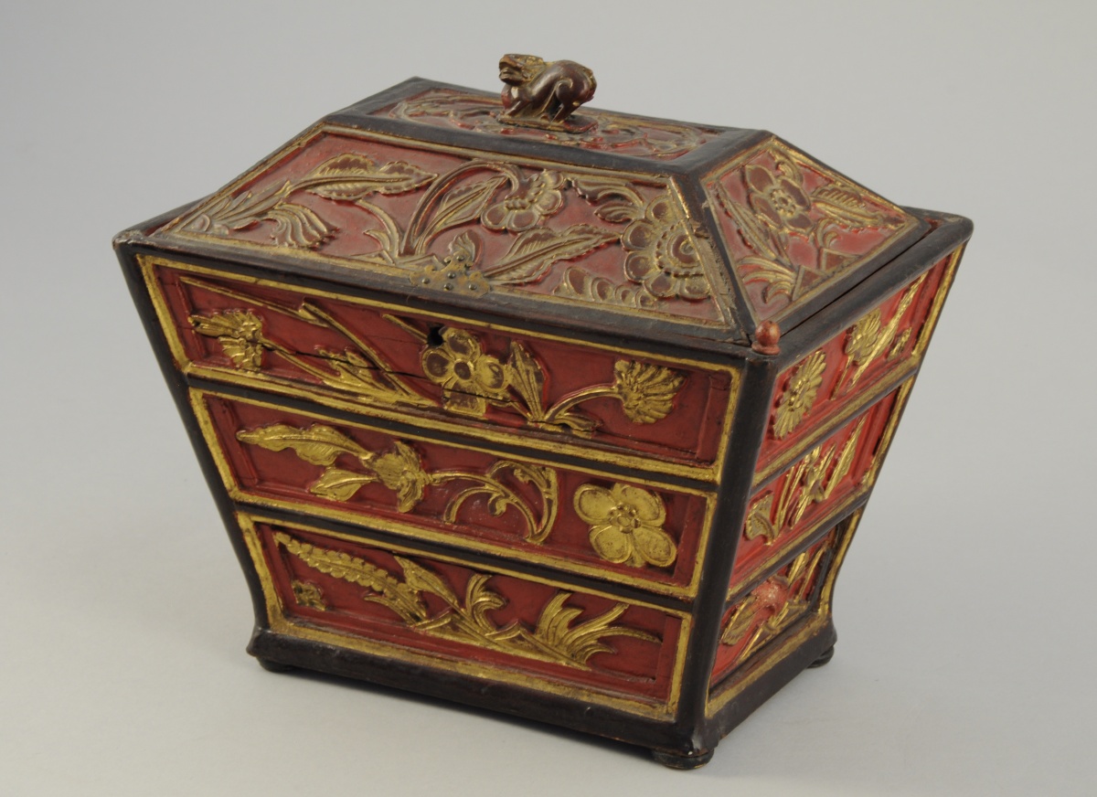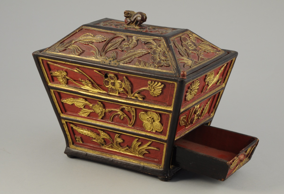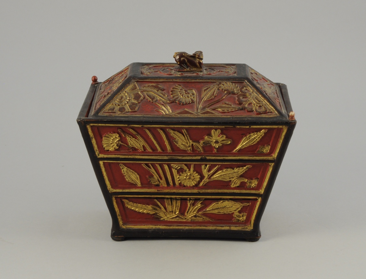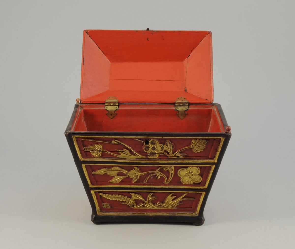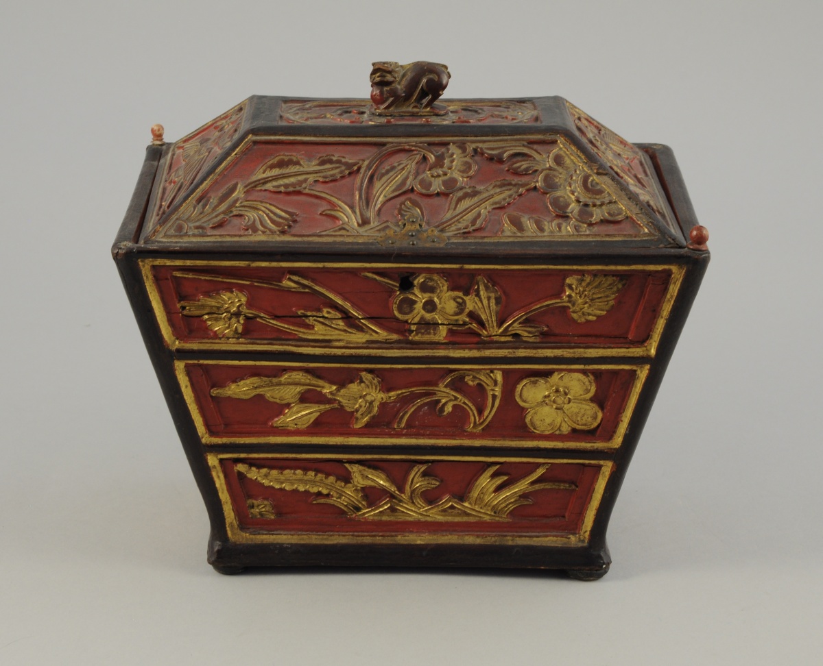 COFFRET de forme trapézoïdale en bois mouluré, sculpté et laqué rouge et or. Il reçoit un décor de fleurs et feuillages stylisés. Le couvercle sommé d'un chien de faux. Il ouvre sur le côté droit par un tiroir secret.