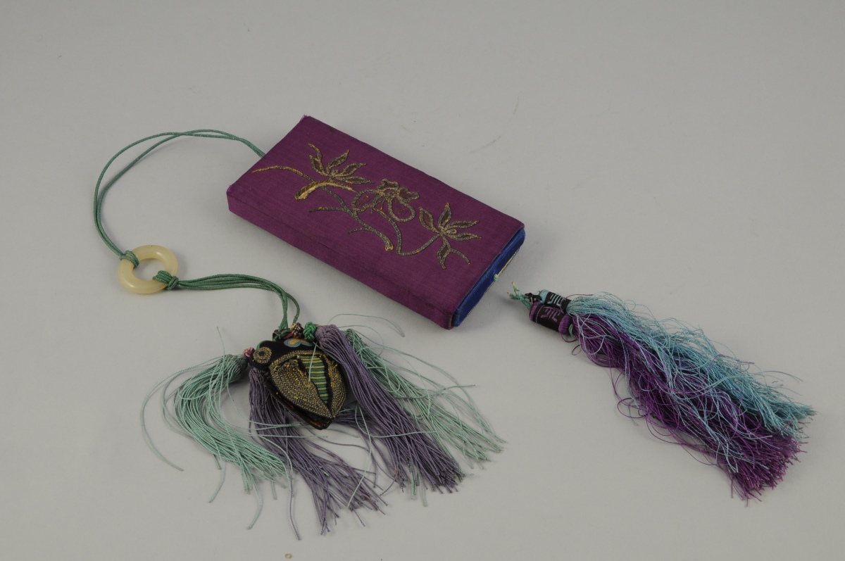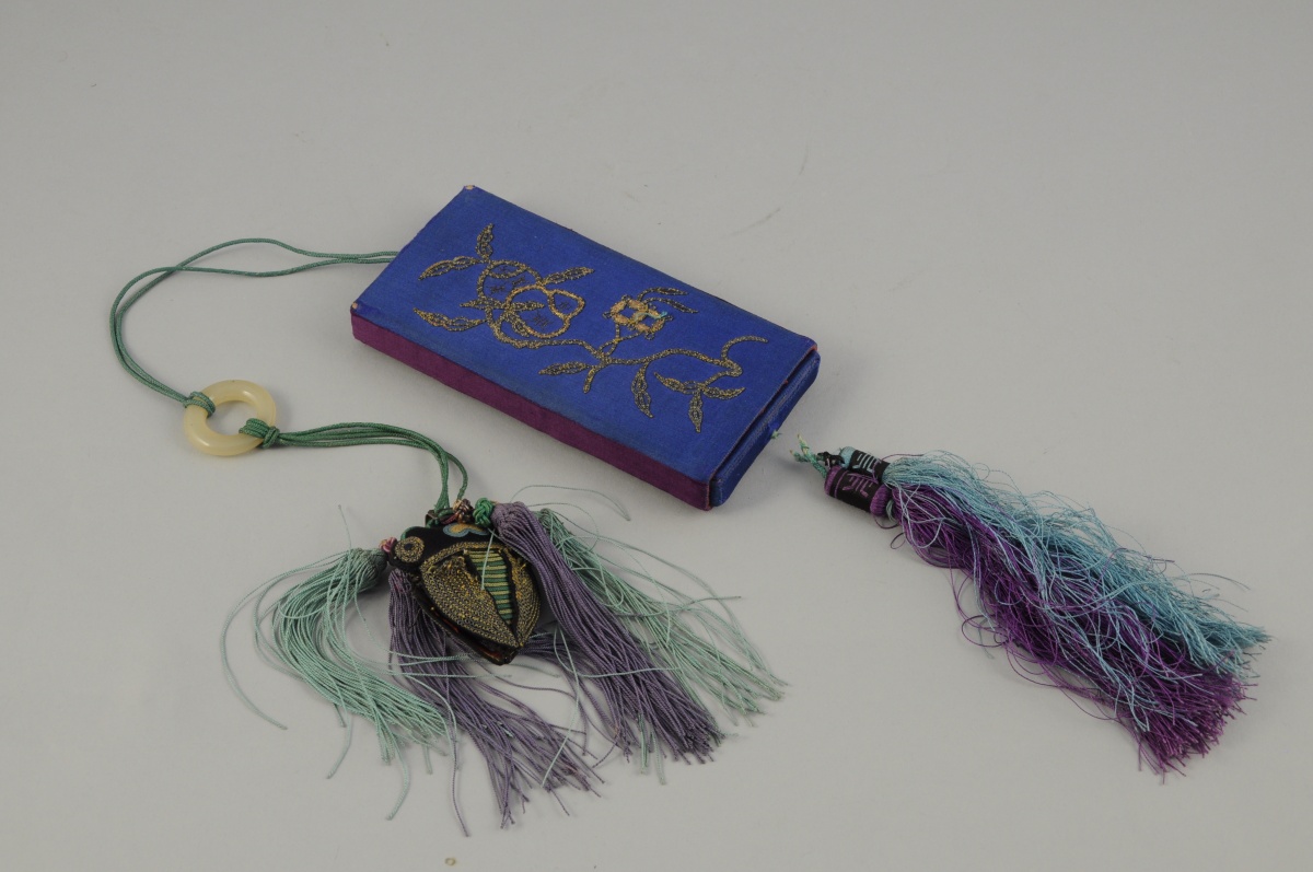 PAIRE DE LUNETTES à verres ronds fumés. Monture en métal signée. Dans étui recouvert de soie bleue et mauve et brodé de motifs floraux et d'idéogrammes. Ce dernier agrémenté d'un cordon garni d'un élément en tissu brodé, d'un anneau de jade (?) et de glands.