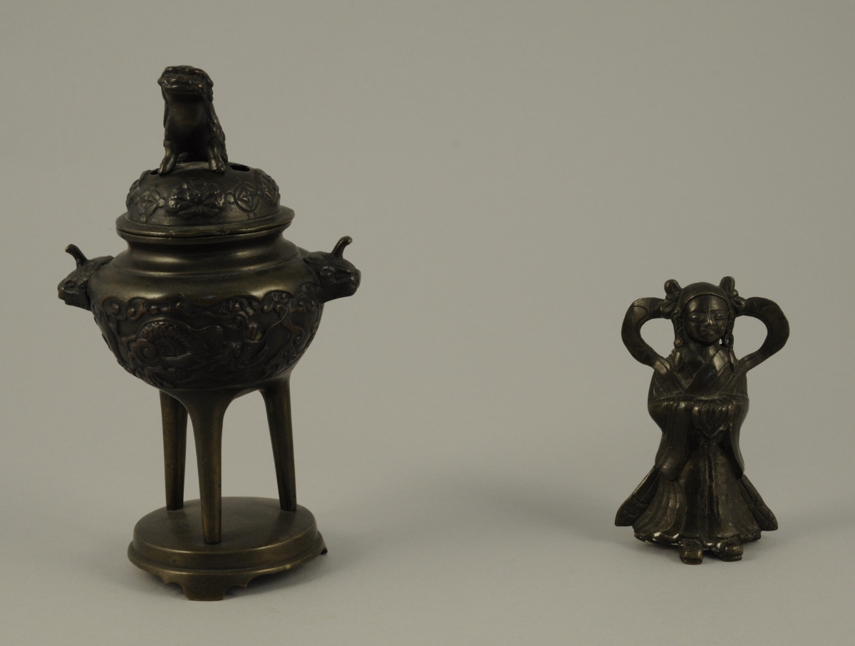 BRÛLE PARFUM tripode en bronze sommé d'un chien de Fô, la panse orné d'un dragon. Chine ?. Haut. 17,5 cm.
