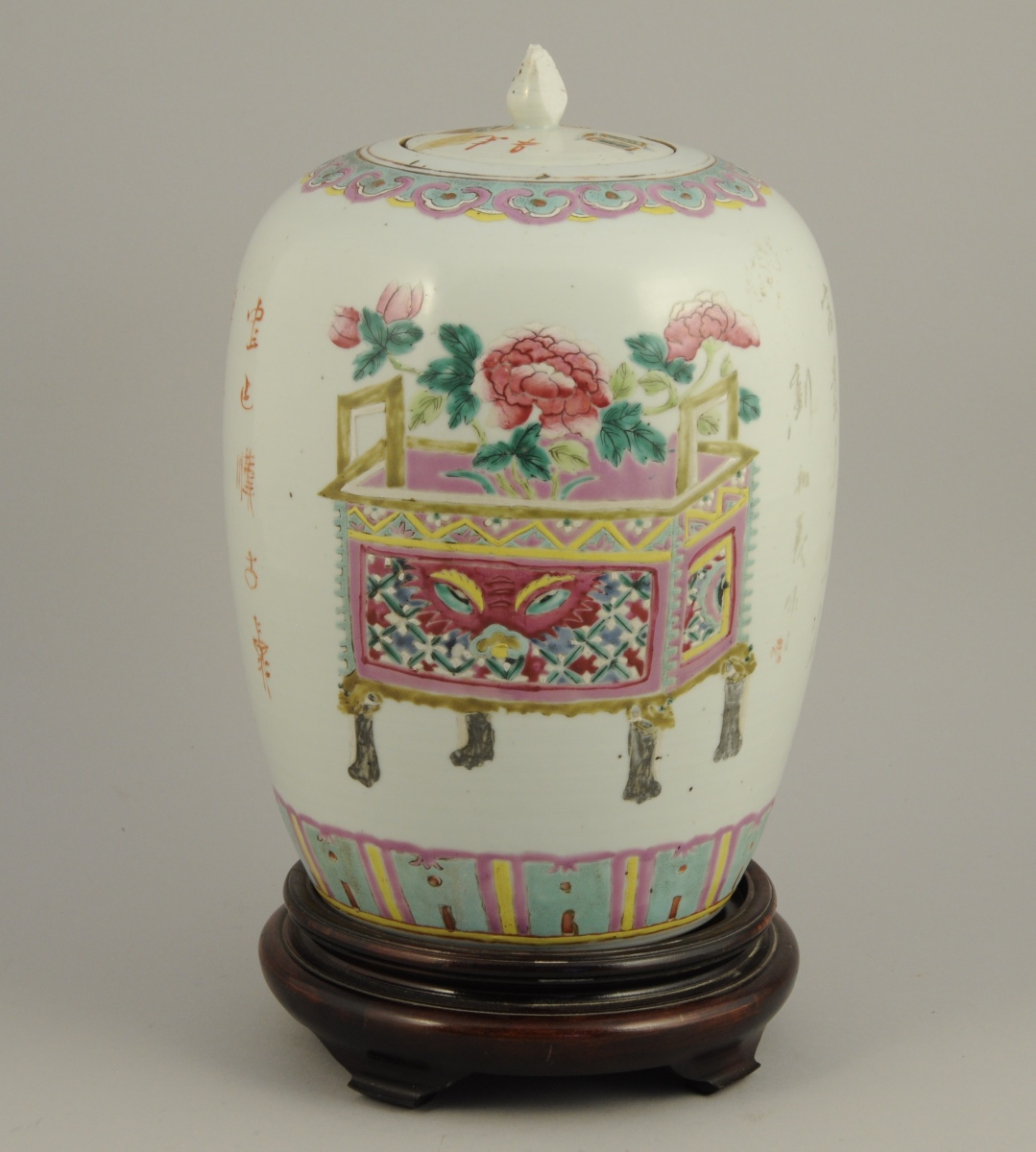 VASE sur un piétement en bois ajouré. Décor d'objets mobiliers et d'une jardinière.
