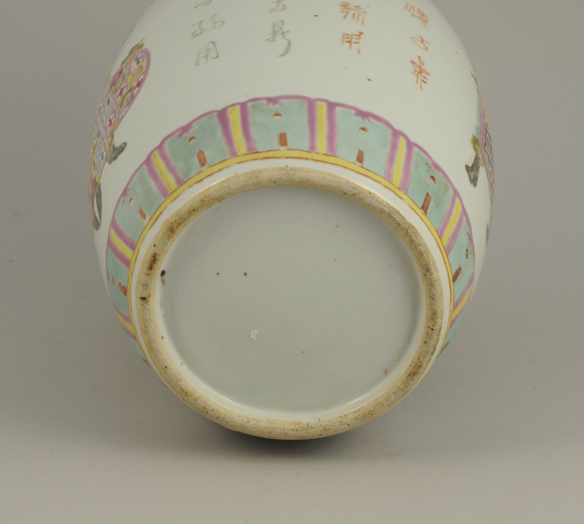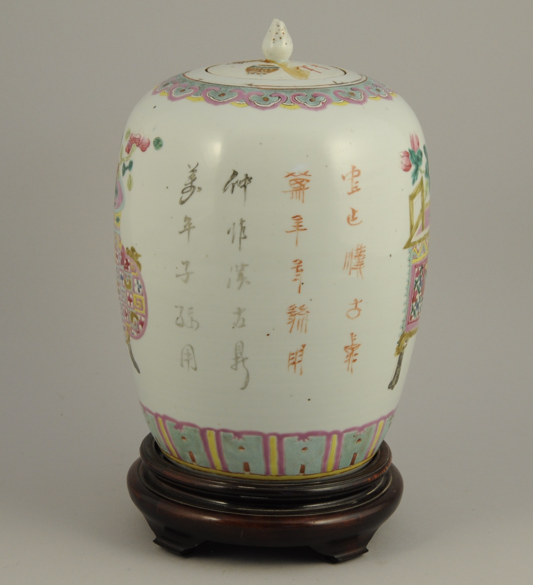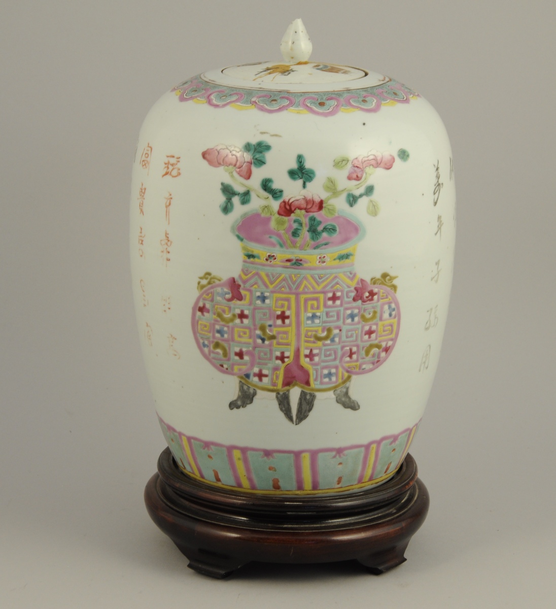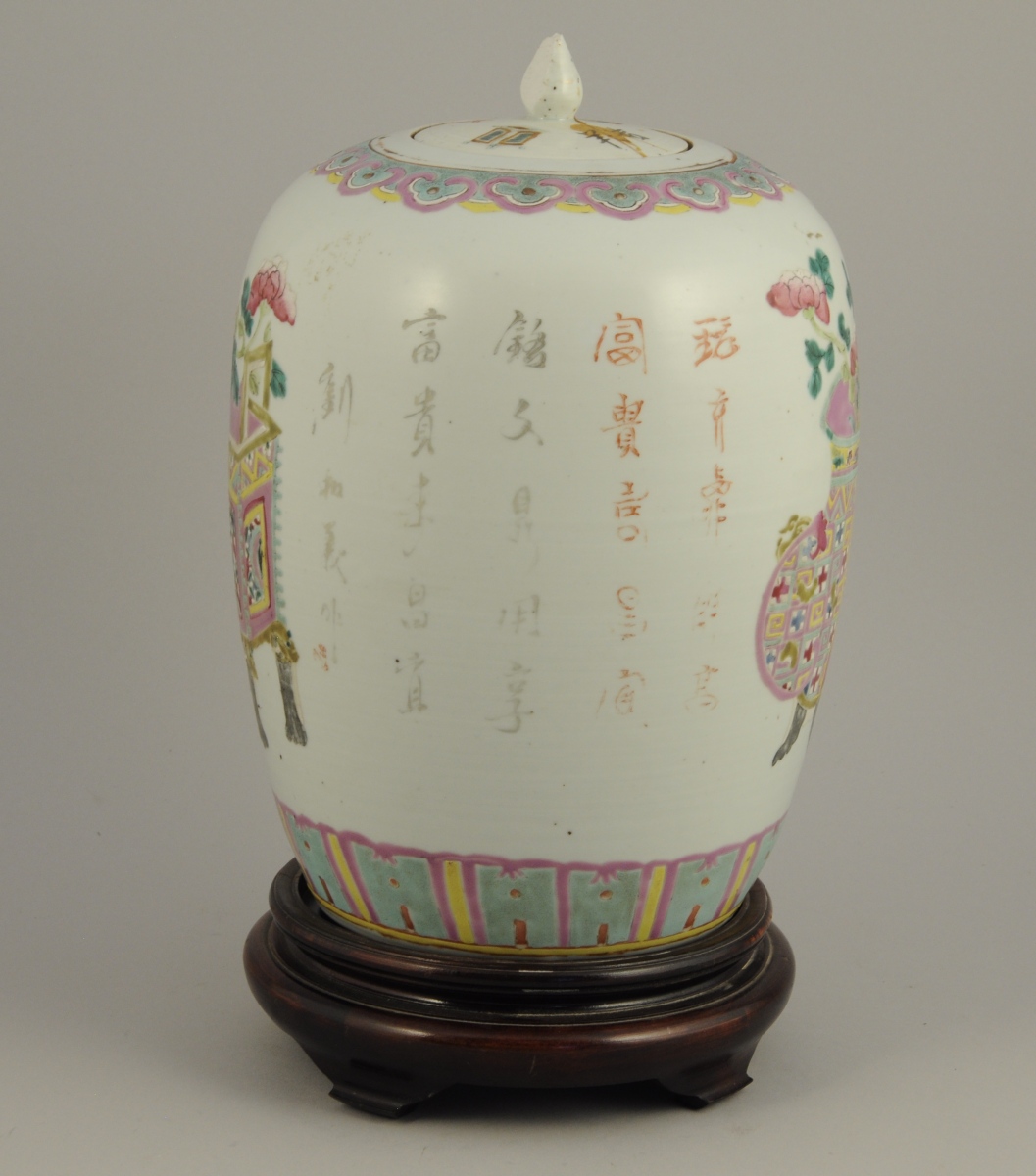 VASE sur un piétement en bois ajouré. Décor d'objets mobiliers...