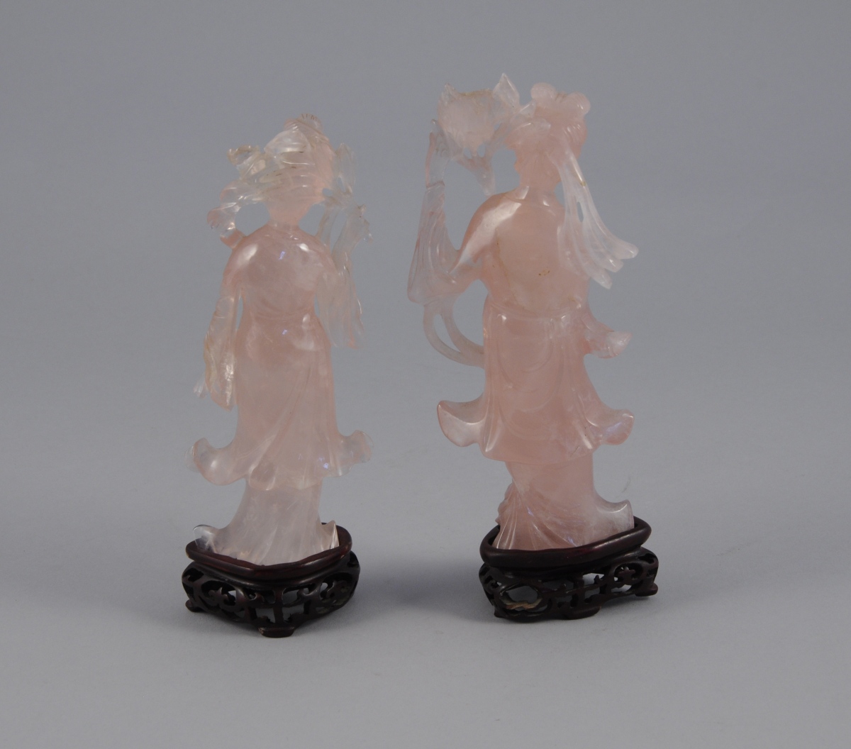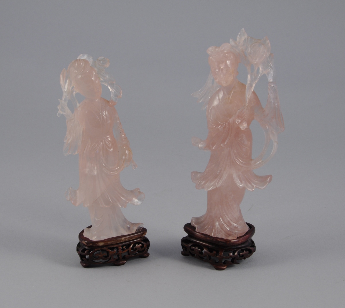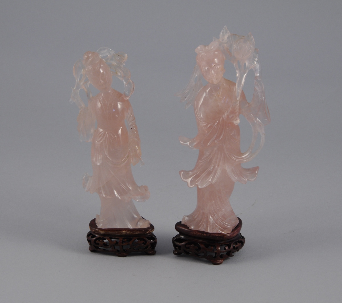 DEUX STATUETTES en quartz rose sculpté figurant une femme portant un rameau fleuri.