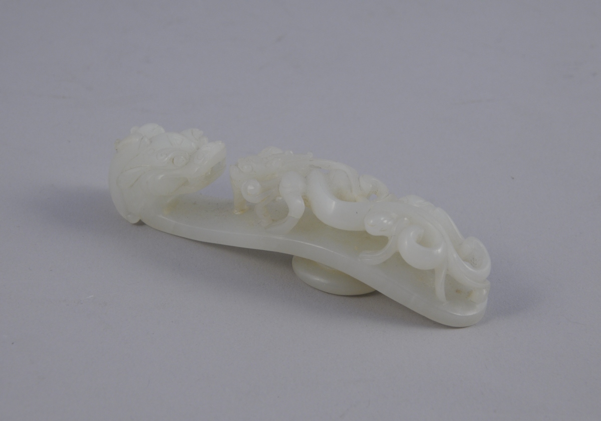 FIBULE en néphrite blanche en forme de dragon à décor sculpté en relief et détaché d'un qilong. Chine, XVIII-XIXème.