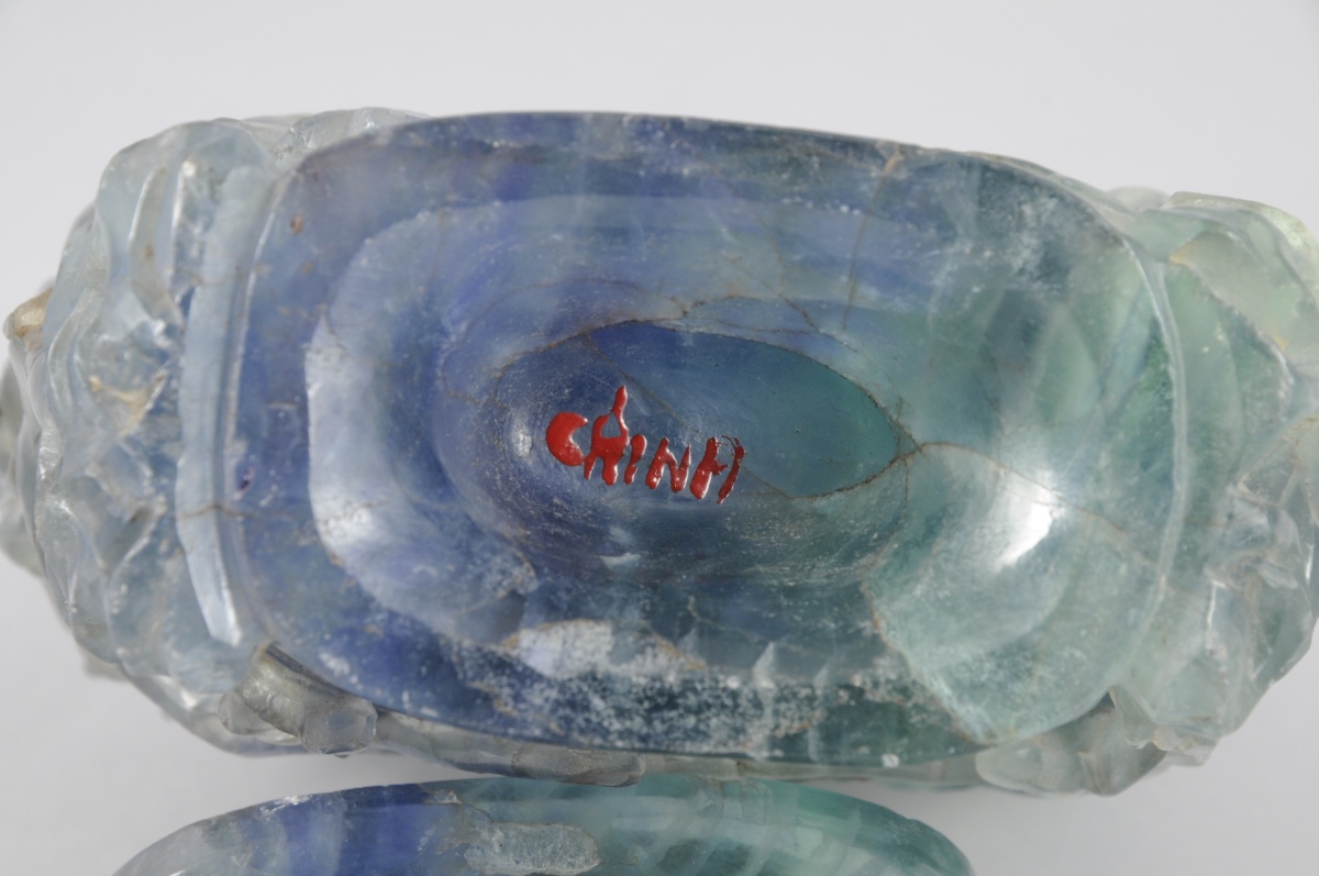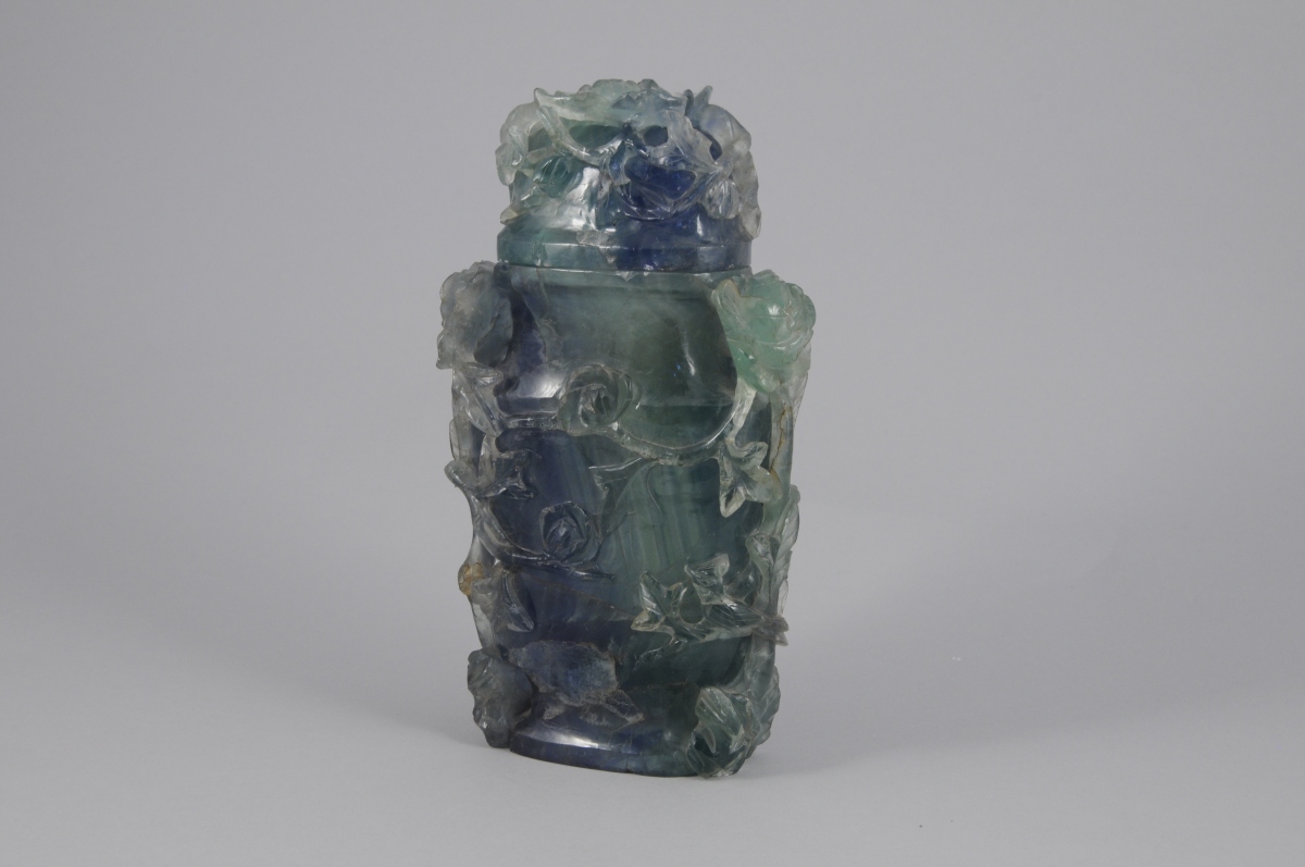 BRÛLE-PARFUM couvert en fluorine (?) sculpté de fleurs et feuillages stylisés et d'un oiseau. Porte en rouge l'inscription "CHINA".