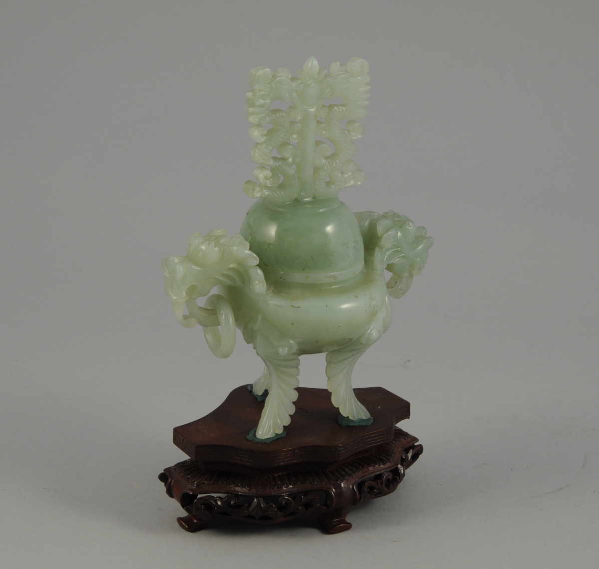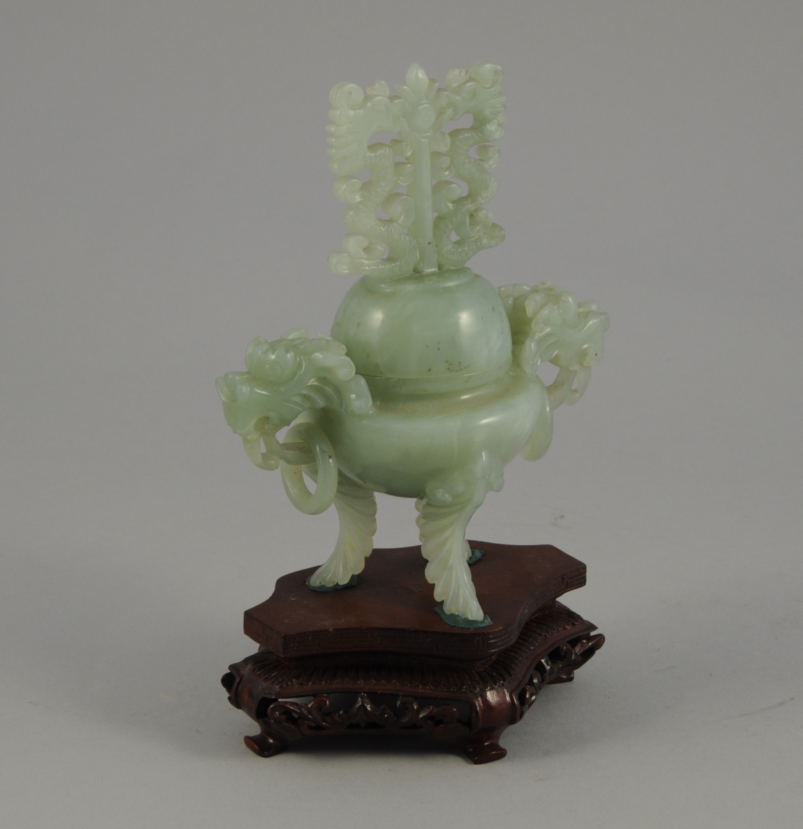 BRÛLE-PARFUM en pierre dure sculptée. Les anses à tête de dragon avec anneau mobile. Le couvercle sculpté de deux serpents fantastiques affrontés. Il repose sur trois pieds sculprtés de godrons.