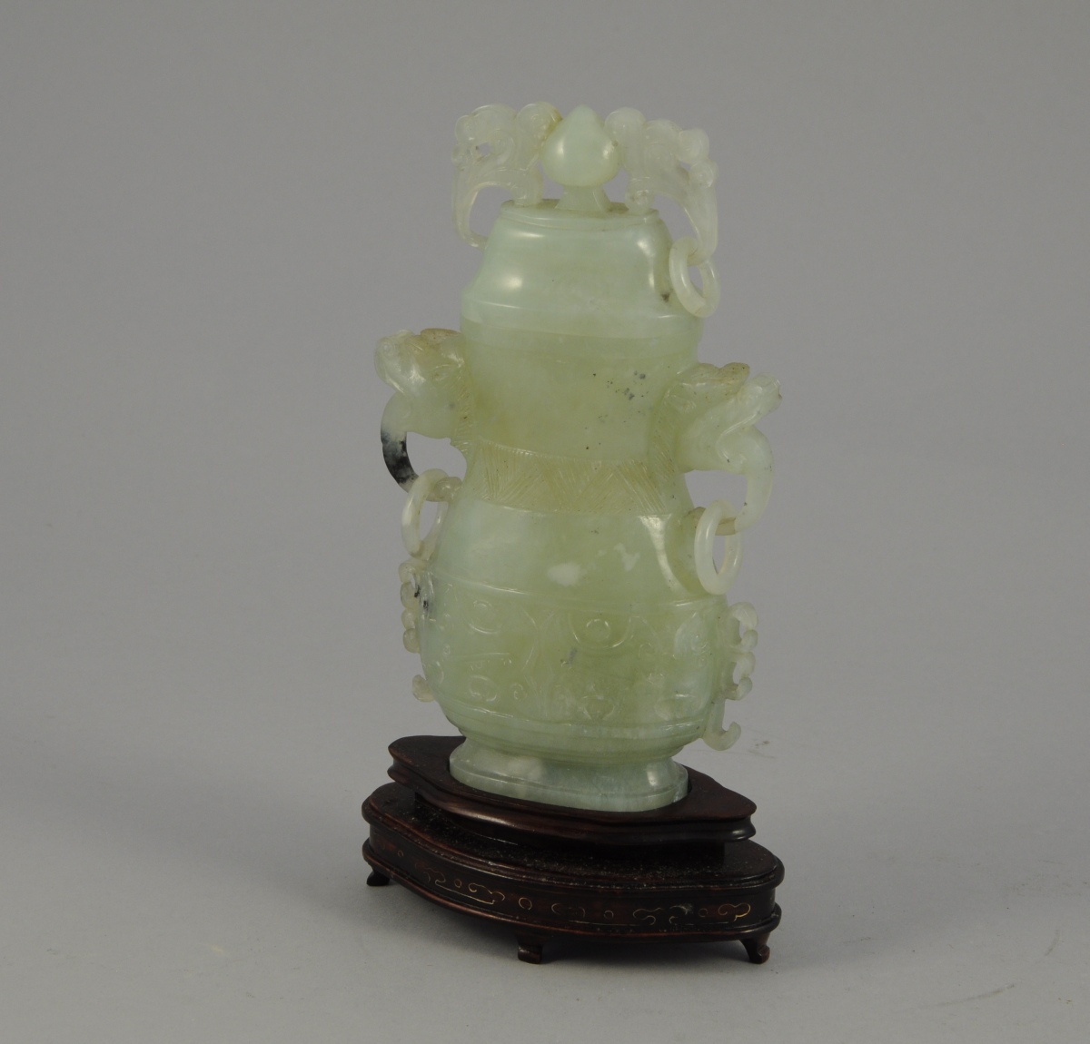 BRÛLE-PARFUM à panse applatie en pierre dure sculptée. Les anses à anneaux mobiles figurant une tête de dragon. La panse ornée d'un masque de taotie.