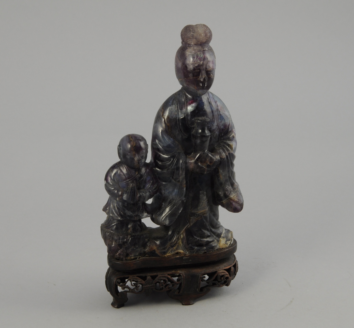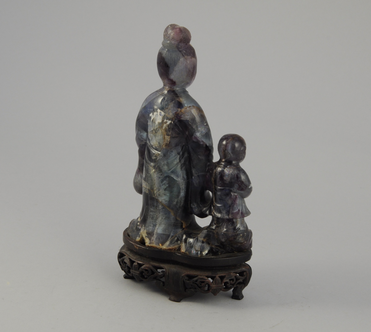 STATUETTE en fluorite sculptée figurant une femme tenant un vase aux côtés d'un enfant tenant ses mains jointes.
