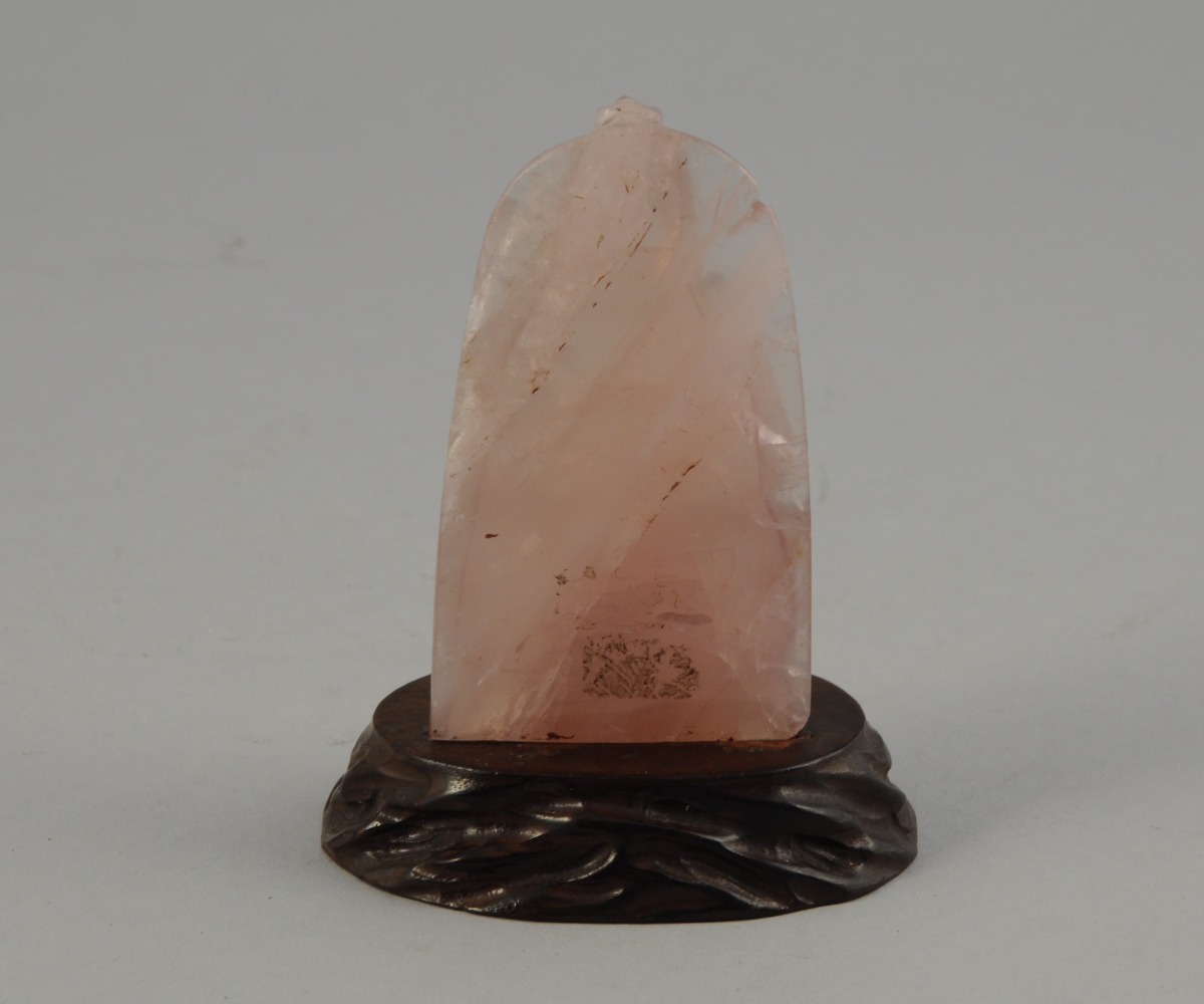 BOUDDHA en quartz rose sculpté en haut relief. Il tient une fleur de lotus de la main gauche.