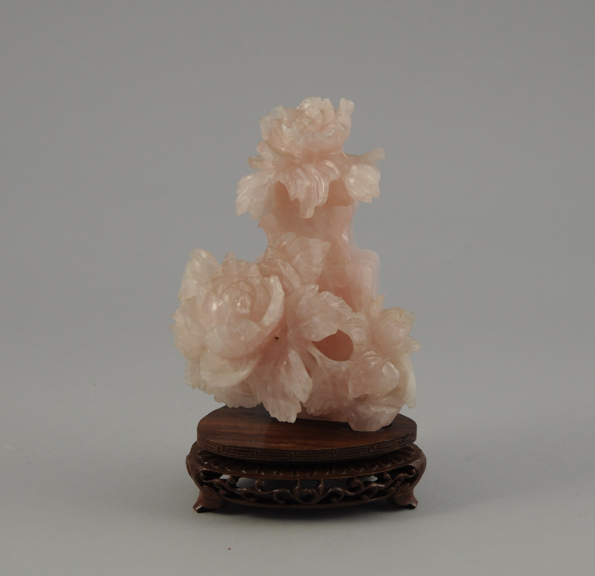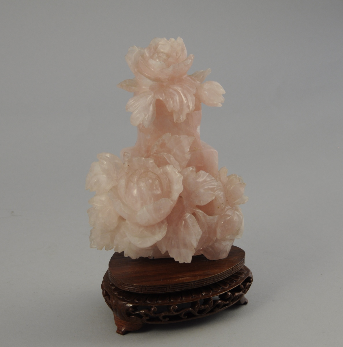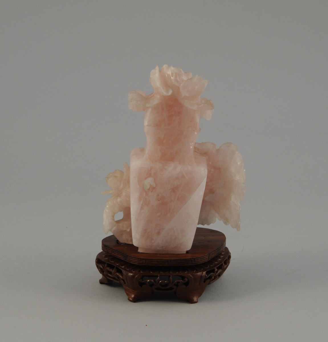 Petit VASE en quartz rose taillé. Il est agrémenté de grandes fleurs de pivoine sur la panse et le couvercle.