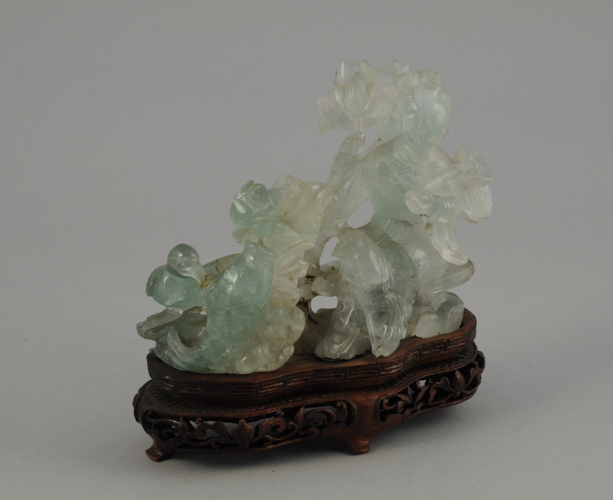 GROUPE en fluorite sculptée figurant une femme assise, les jambes croisées, tenant, de la main droite, une fleur de lotus et, de la main gauche, une épuisette. Elle porte son regard sur un oiseau aux prises avec une carpe.