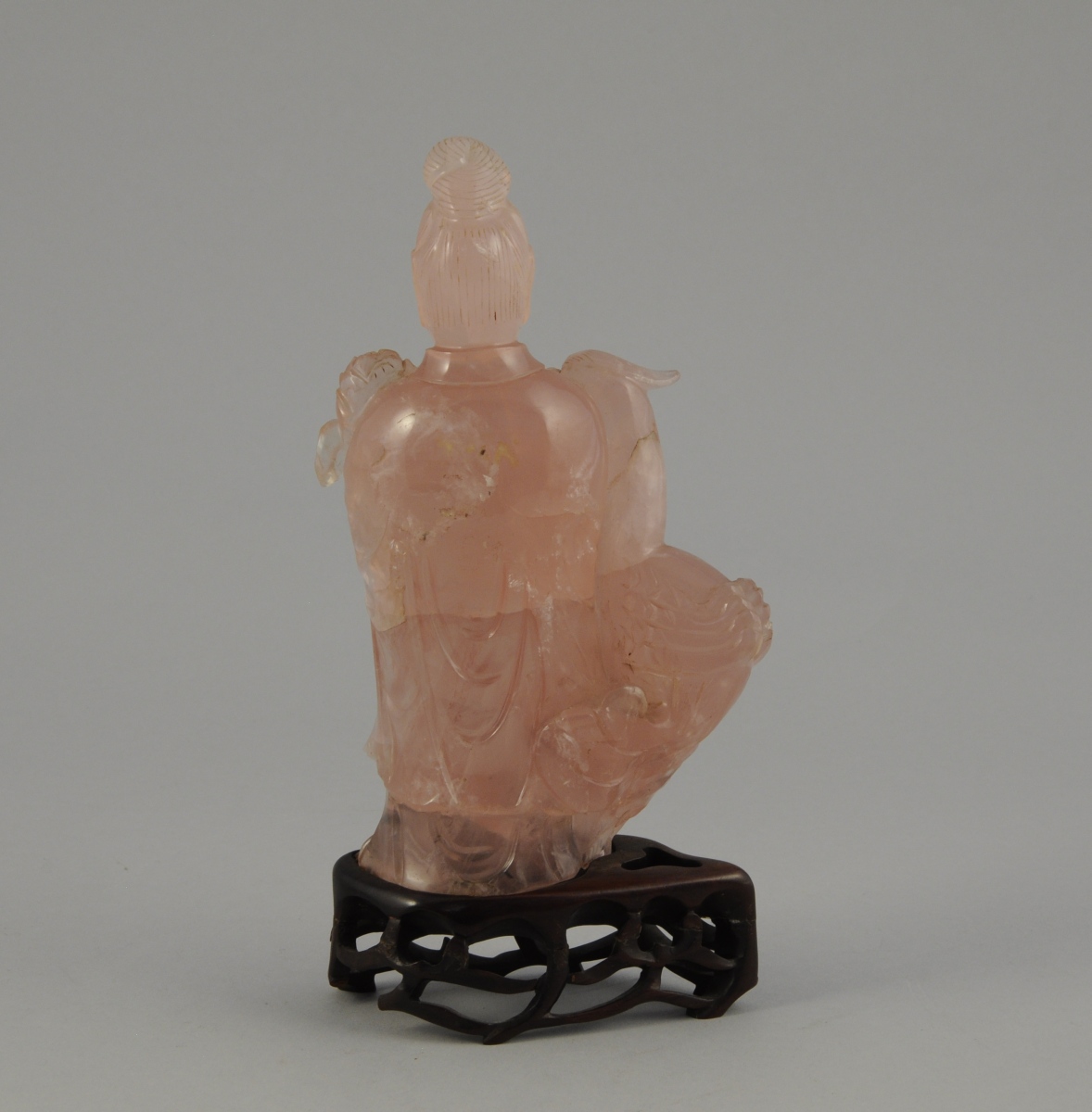 STATUETTE en quartz rose sculpté figurant un homme tenant une fleur de lotus. À sa droite se dresse un grand oiseau.