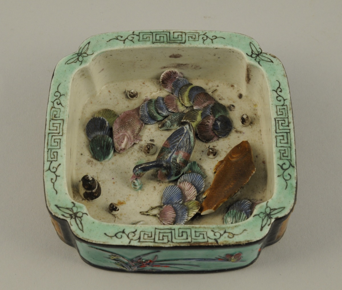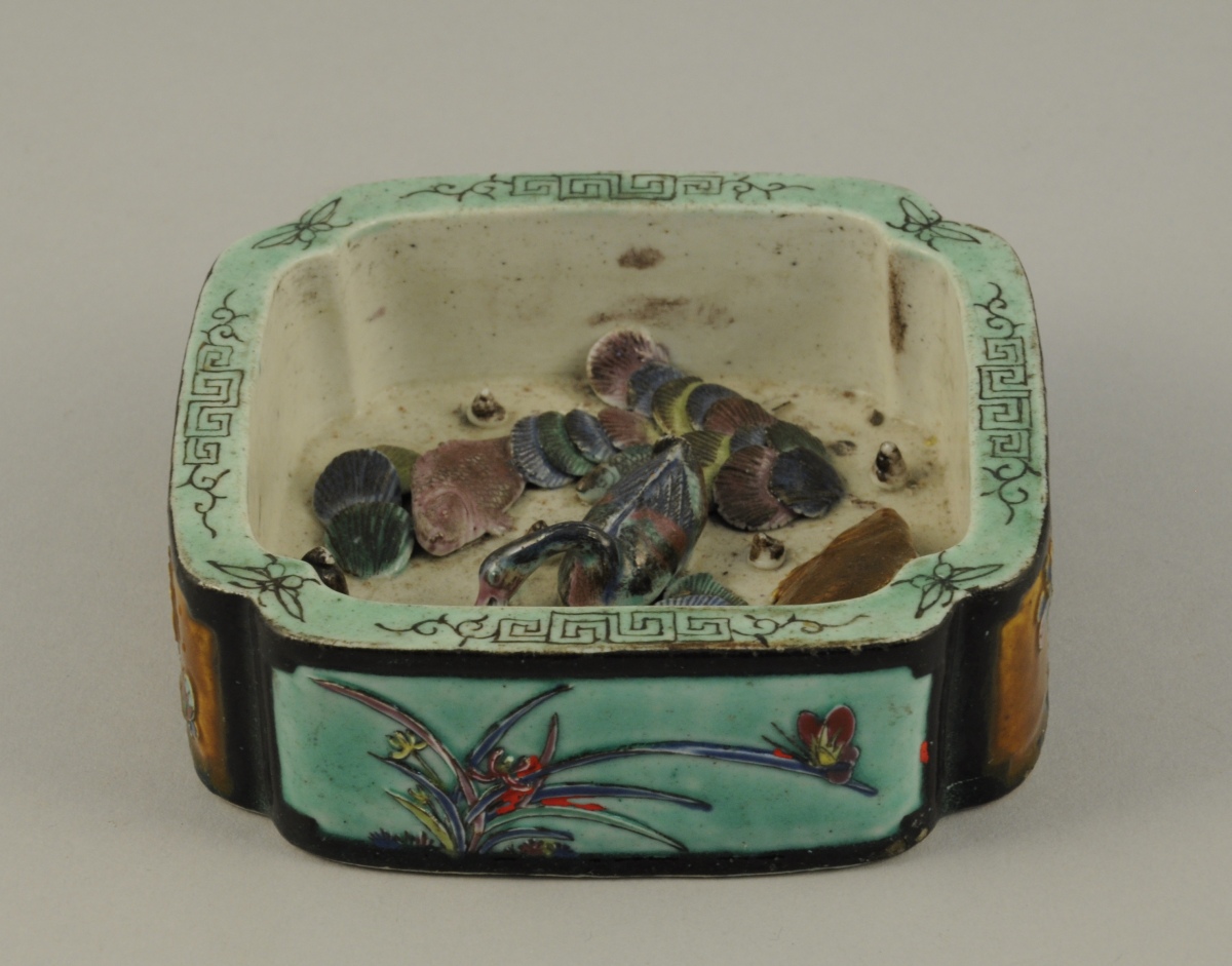 BASSIN en porcelaine polychrome de forme rectangulaire à décor au naturel rapporté d'un canard, de poissons, de coquillages et d'une carpe. Cachet vert.