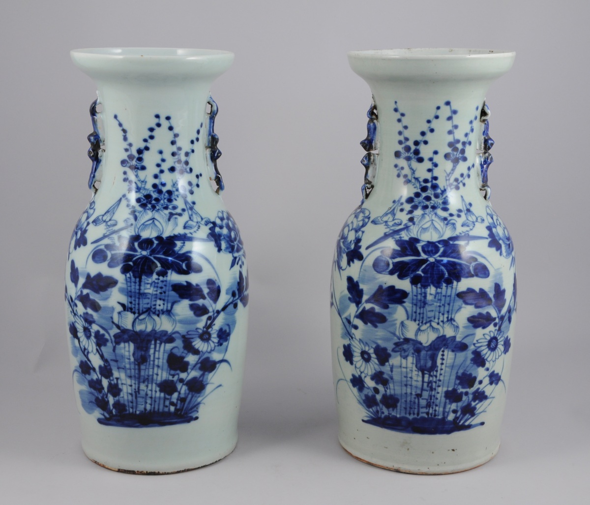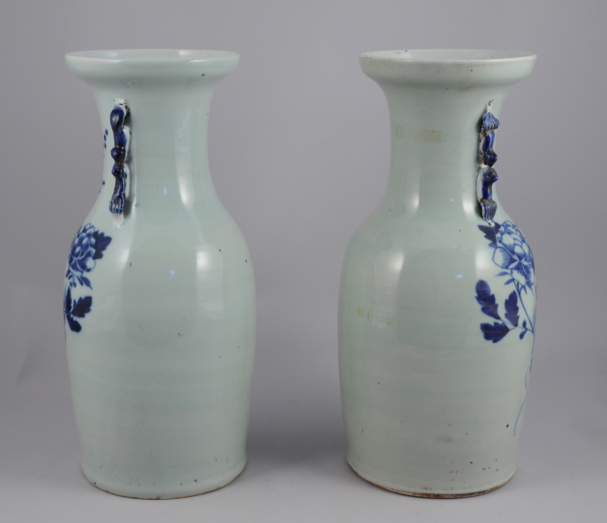 PAIRE de VASES balustres en porcelaine à décor en bleu sous couverte de pivoines dans leurs feuillages.