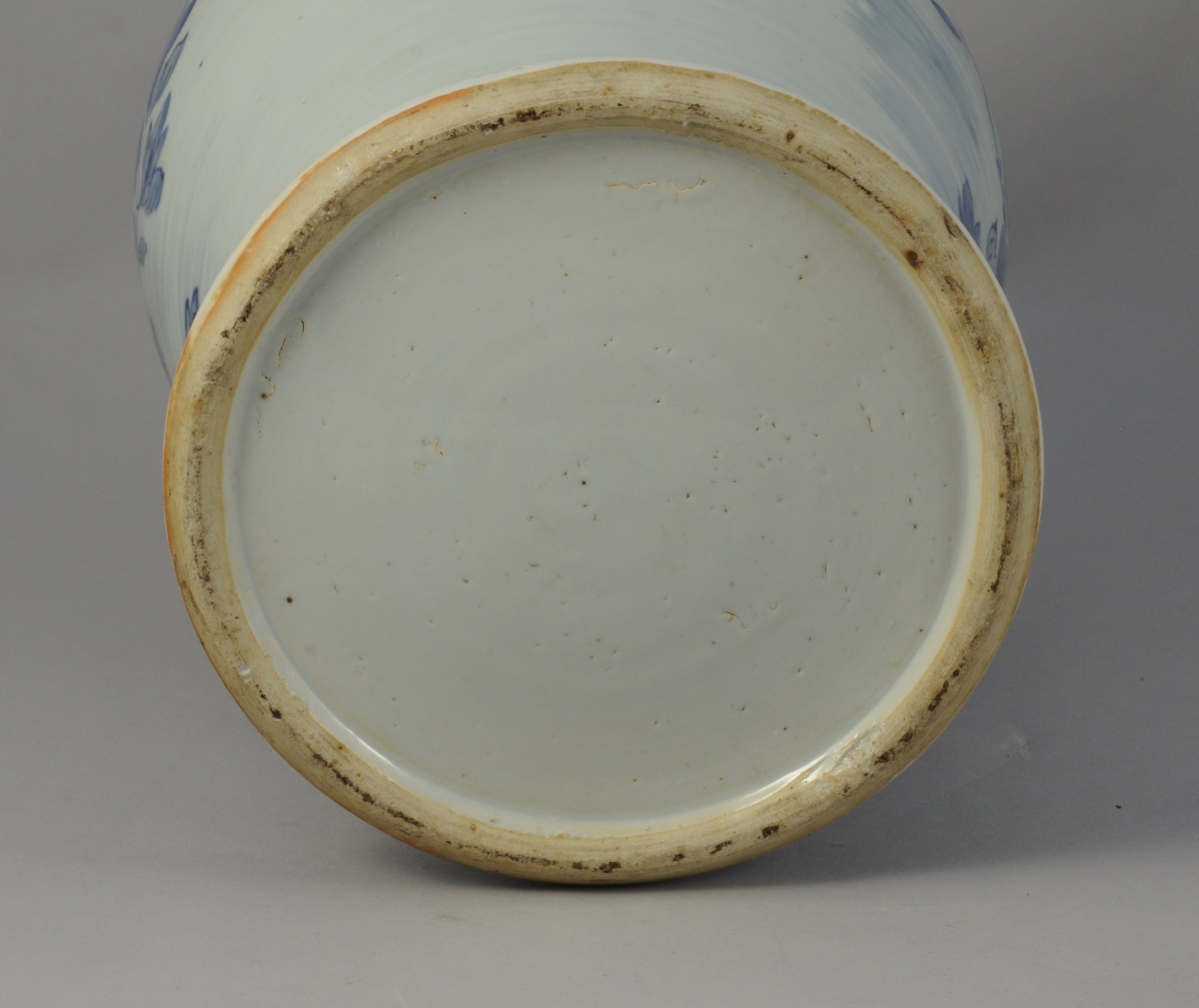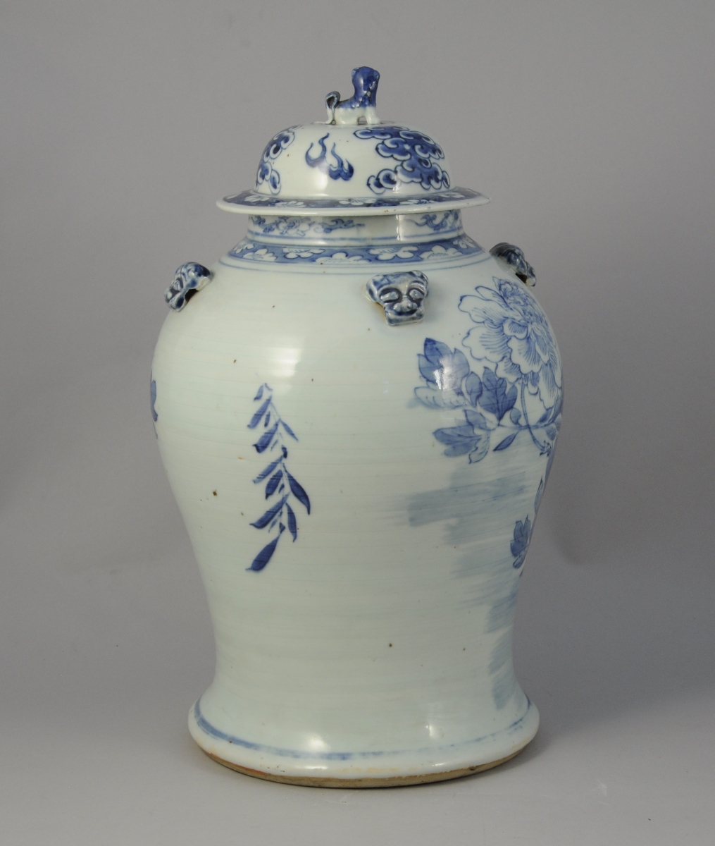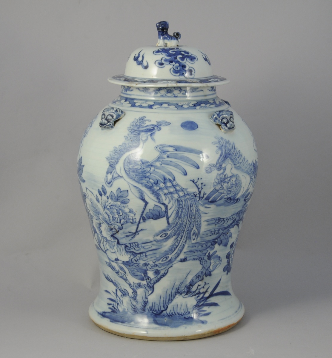 VASE COUVERT, en porcelaine blanc et bleu figurant un phoenix. L'épaulement orné de têtes de chien de Fô.