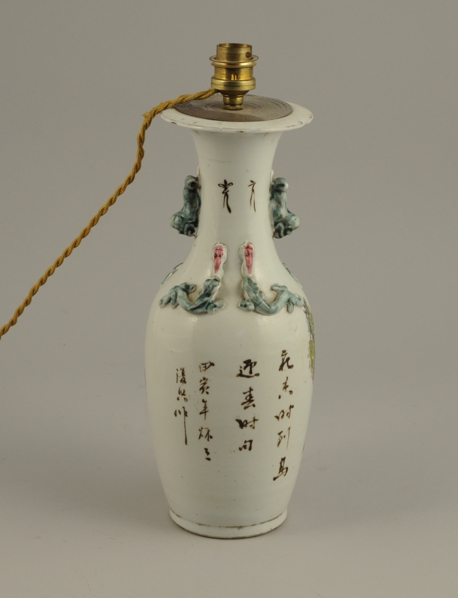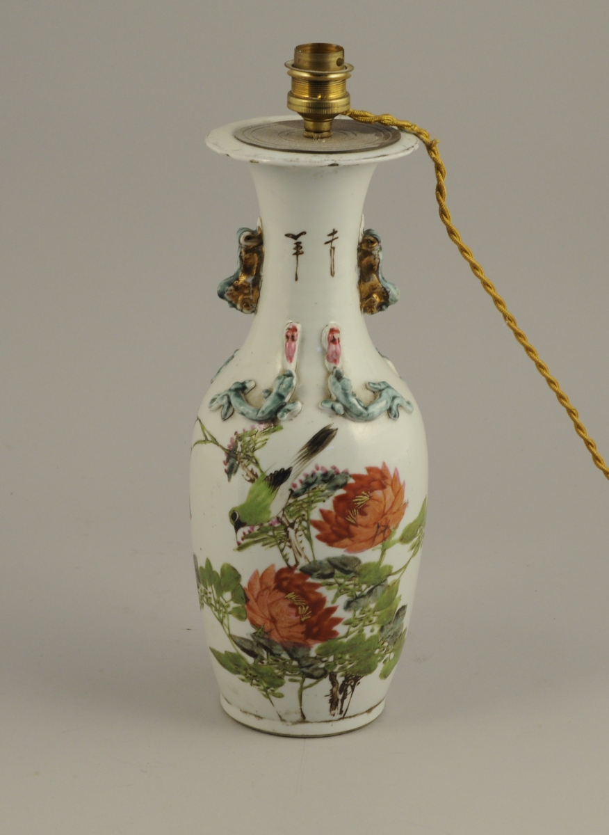 VASE en porcelaine. Décor polychrome d'un oiseau branché sur une pivoine, de dragons en demi-relief et d'idéogrammes.