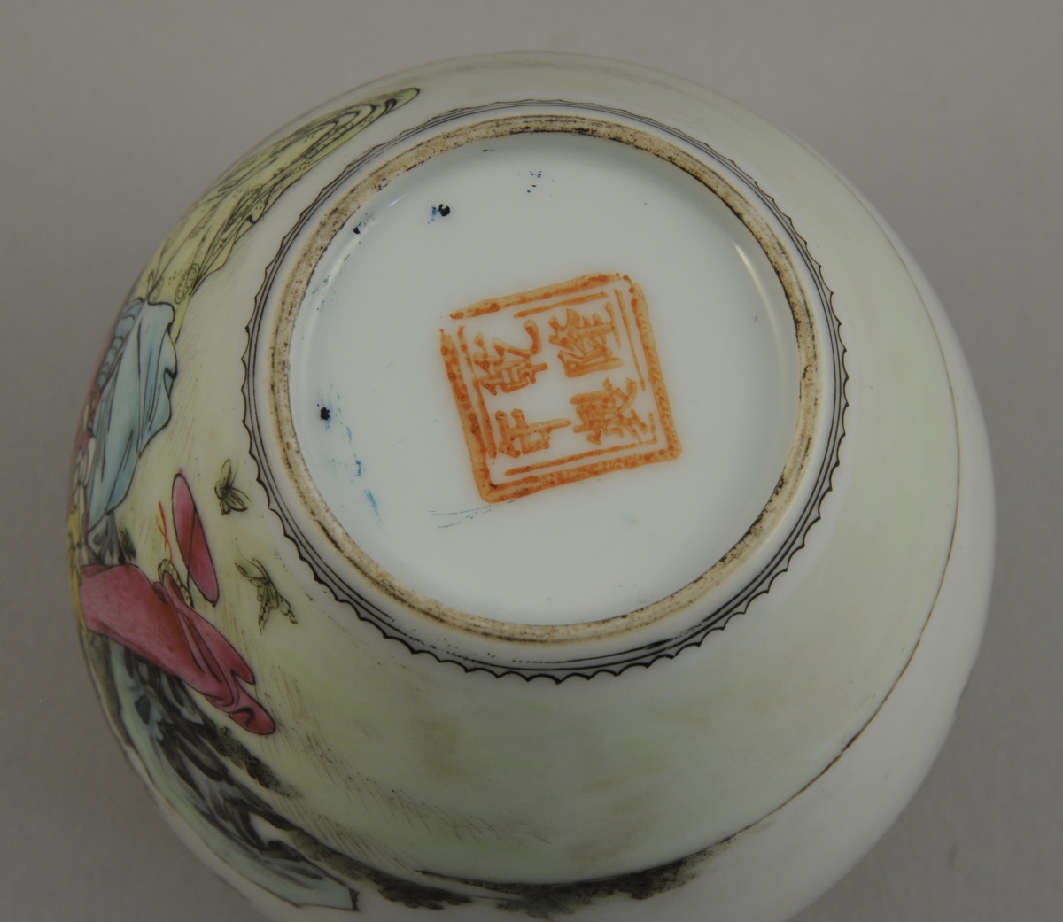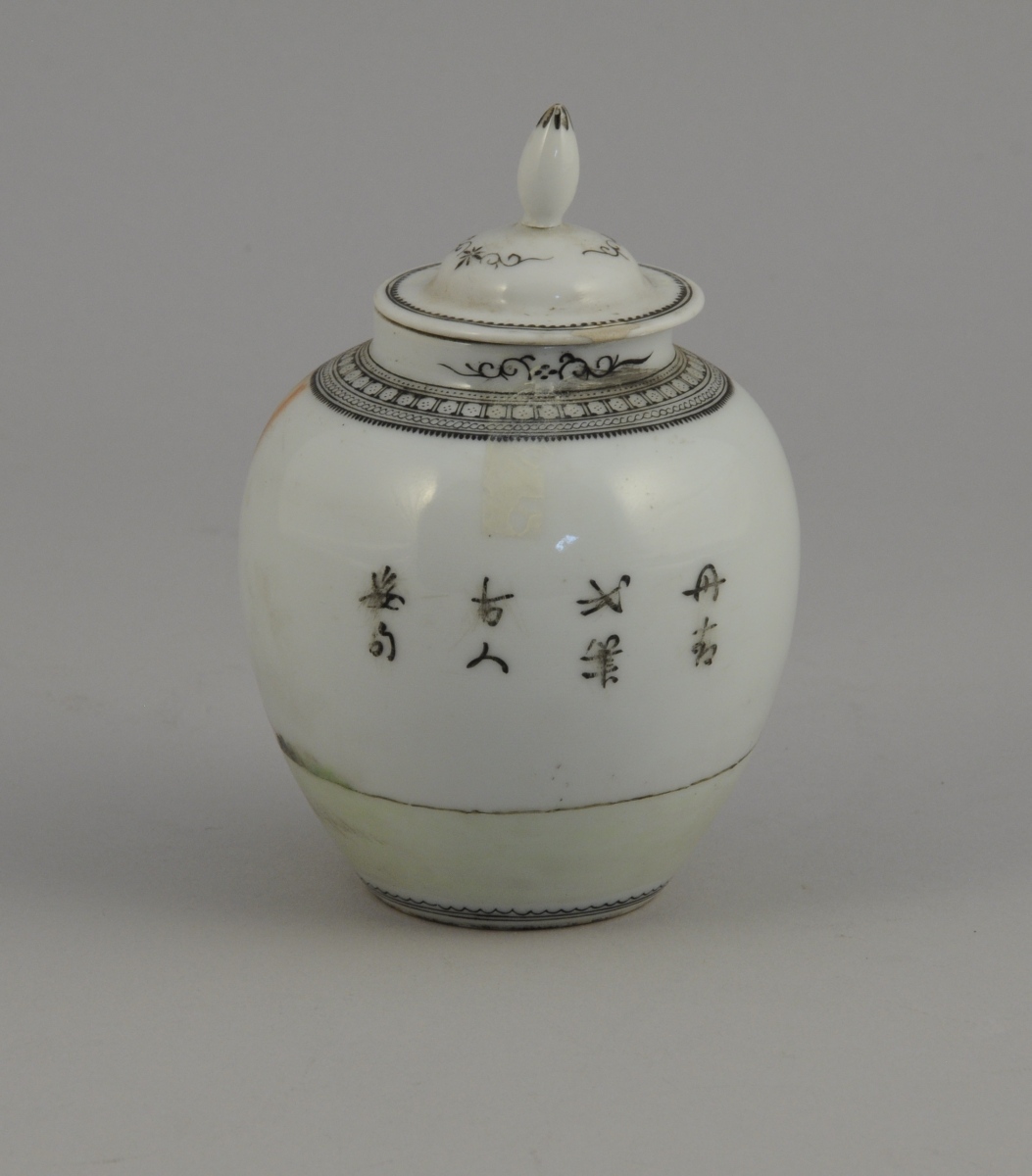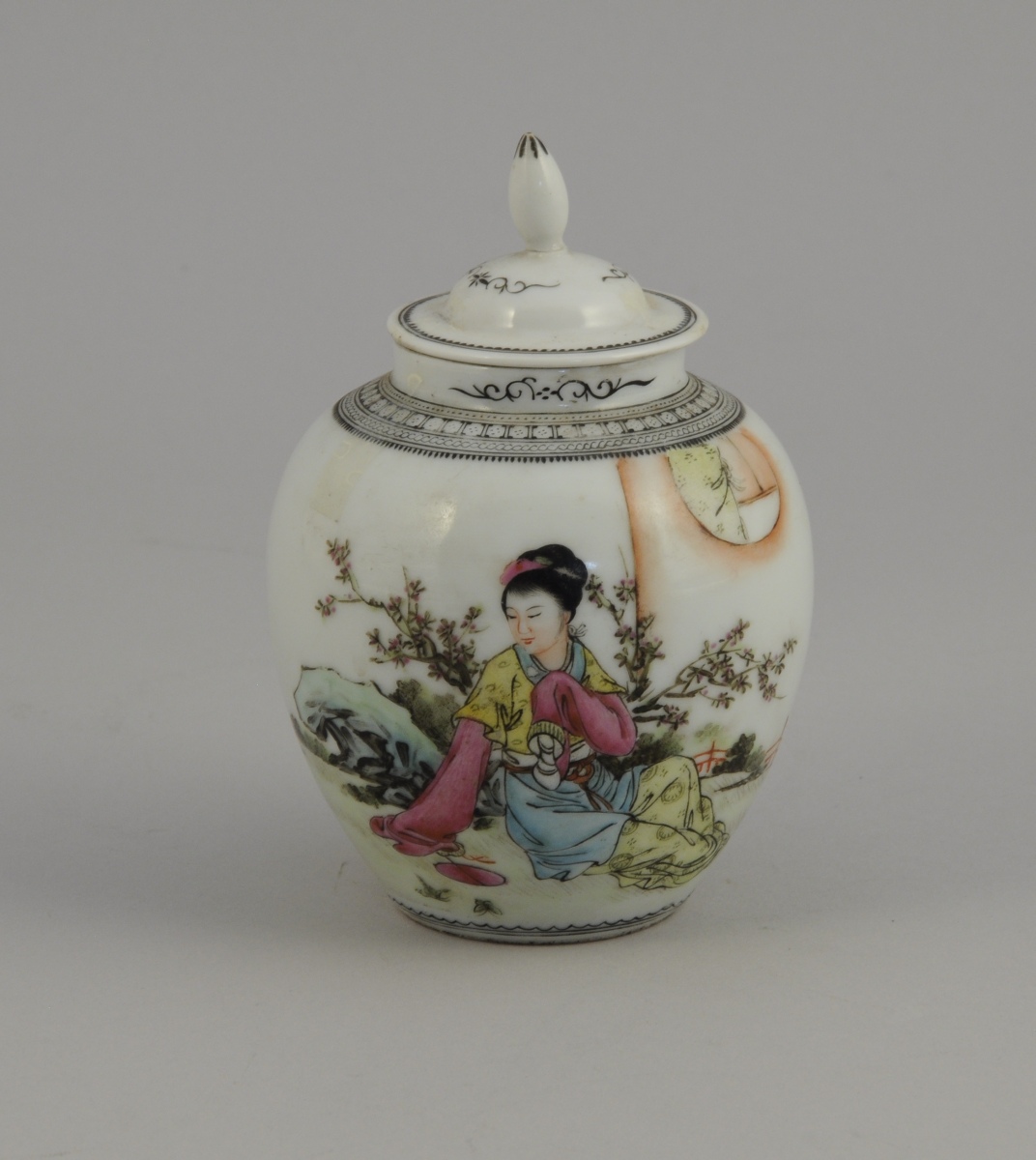 Petit POT COUVERT en porcelaine à décor polychrome d'une élégante se reposant dans un jardin. Cachet rouge sous la base.