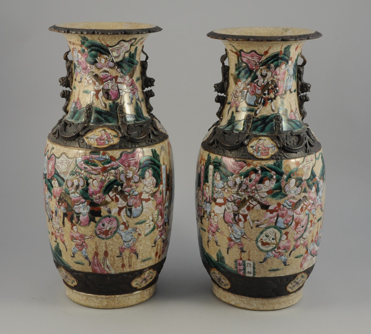 PAIRE de VASES balustre en céramique craquelée à décor polychrome de scènes de combat. Marque en creux.
