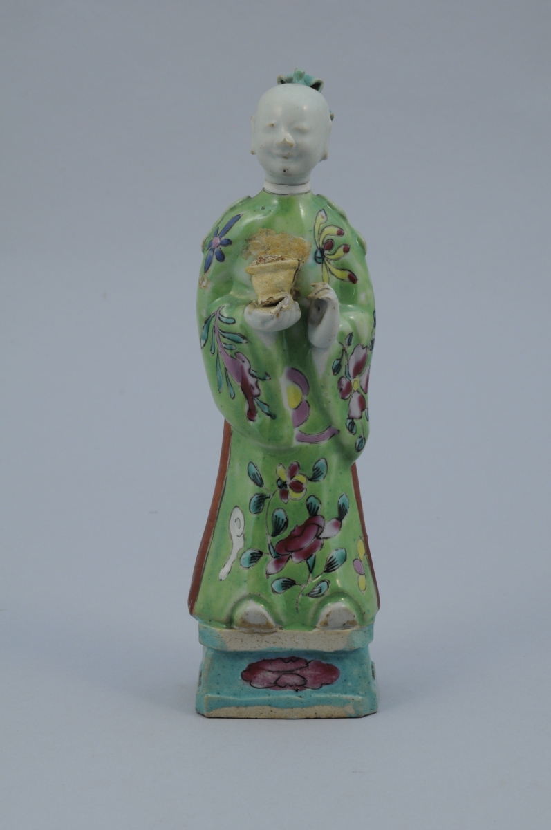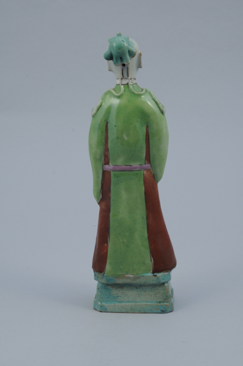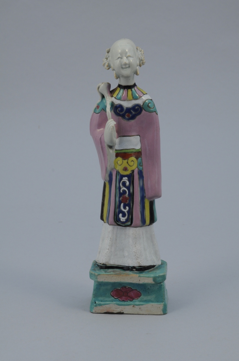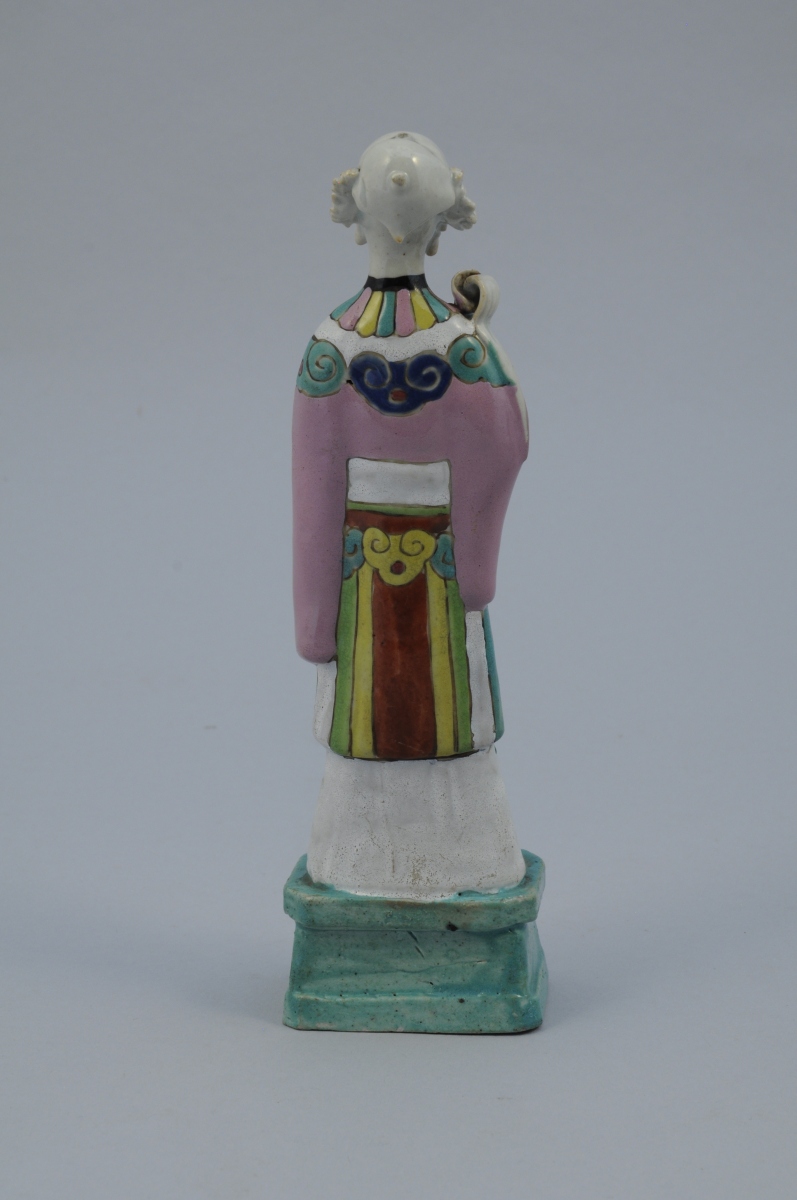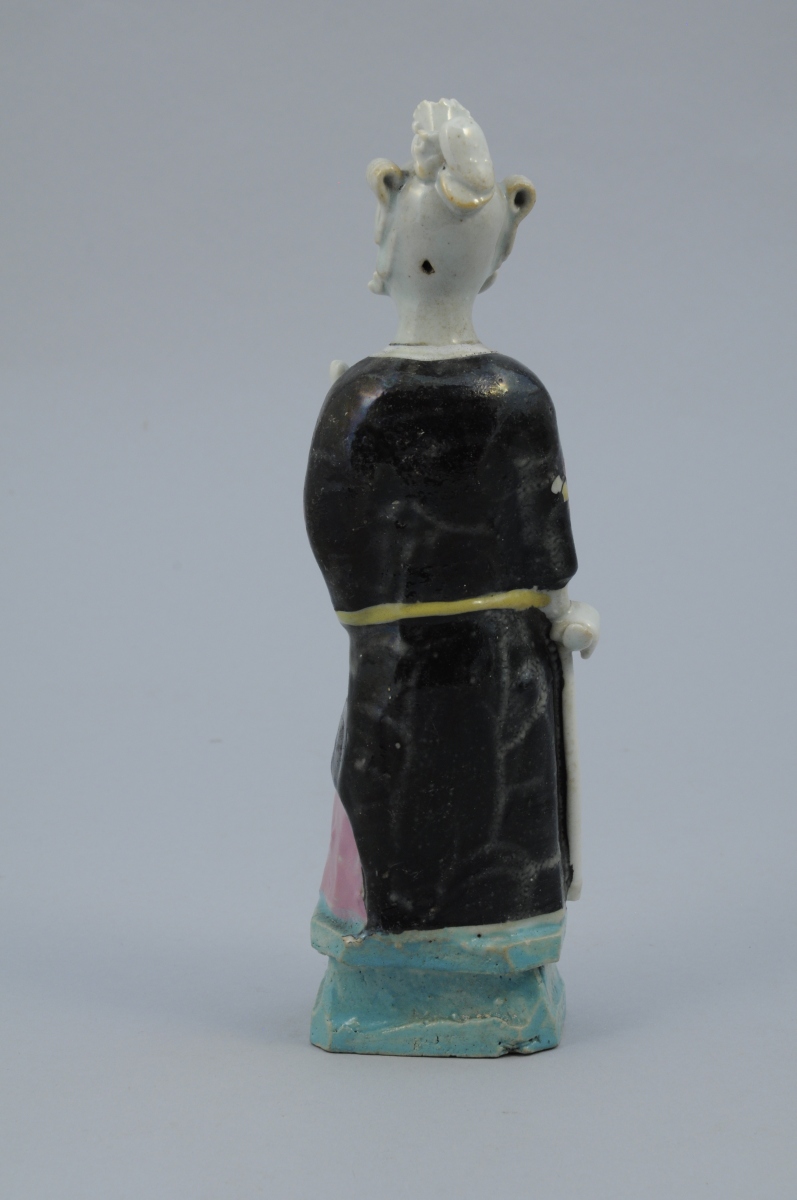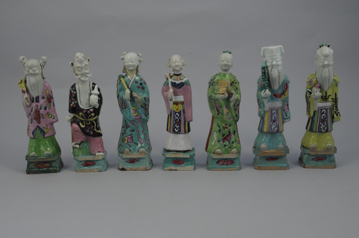 SEPT STATUETTES en porcelaine aux émaux de la famille rose représentant des personnages. Chacune percée à l'arrière de la tête.