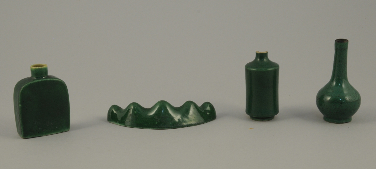 TROIS PETITS FLACONS, cylindrique, quadrangulaire et de forme bouteille en porcelaine émaillée vert.