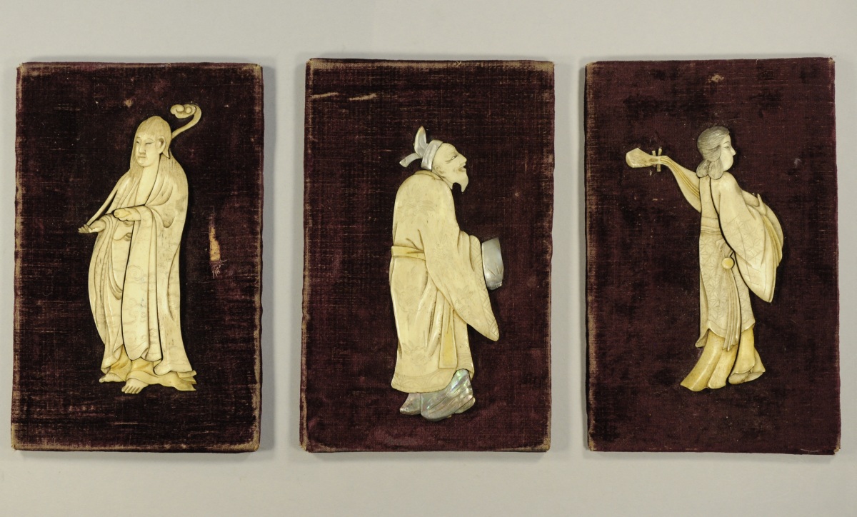 ENSEMBLE de trois BAS-RELIEFS représentant des personnages constitués d'éléments en os et nacre sculpté et gravés.