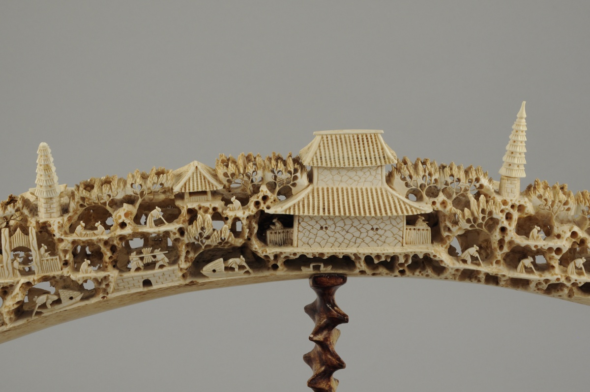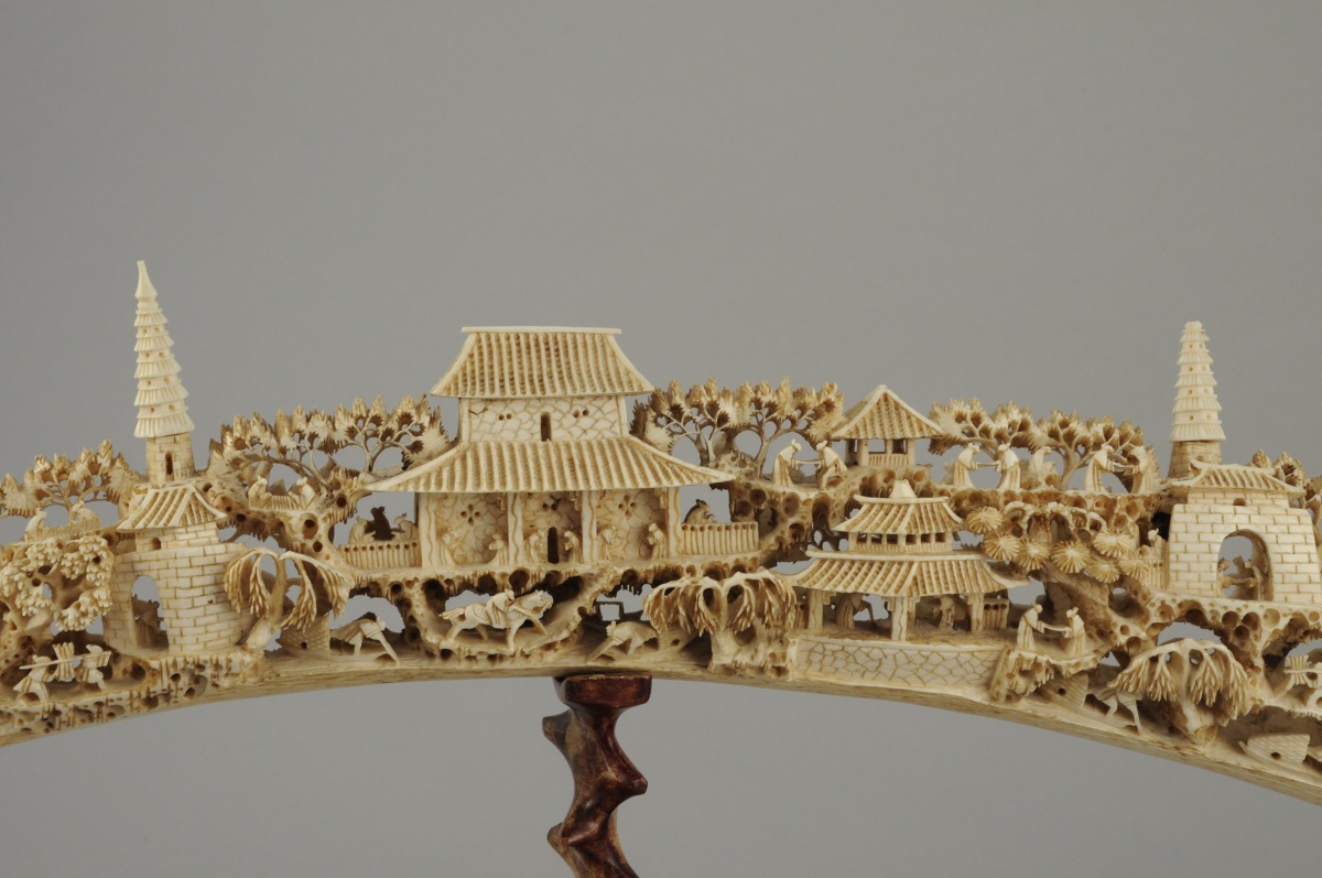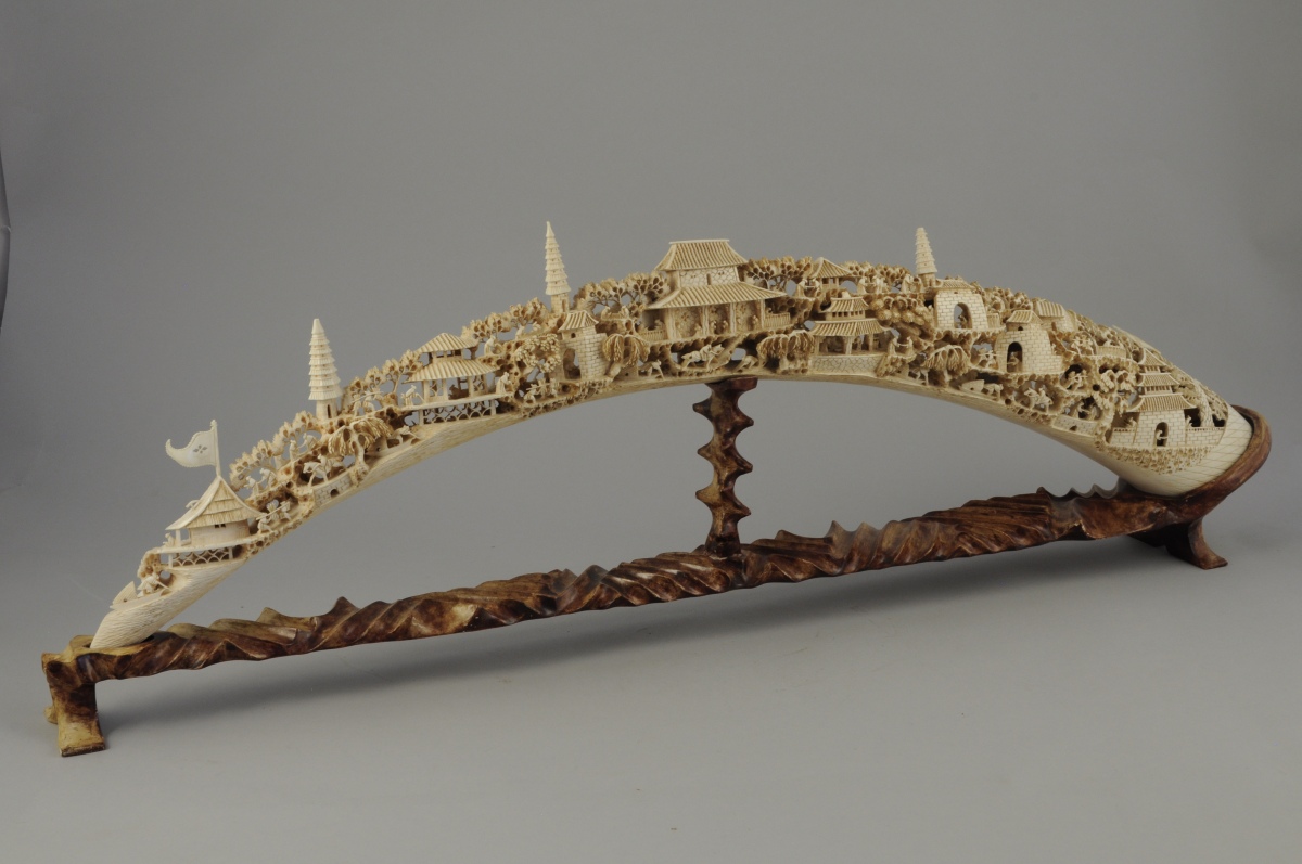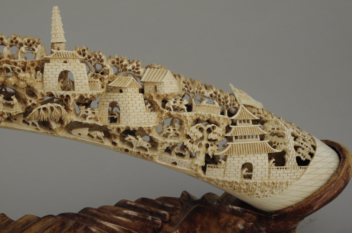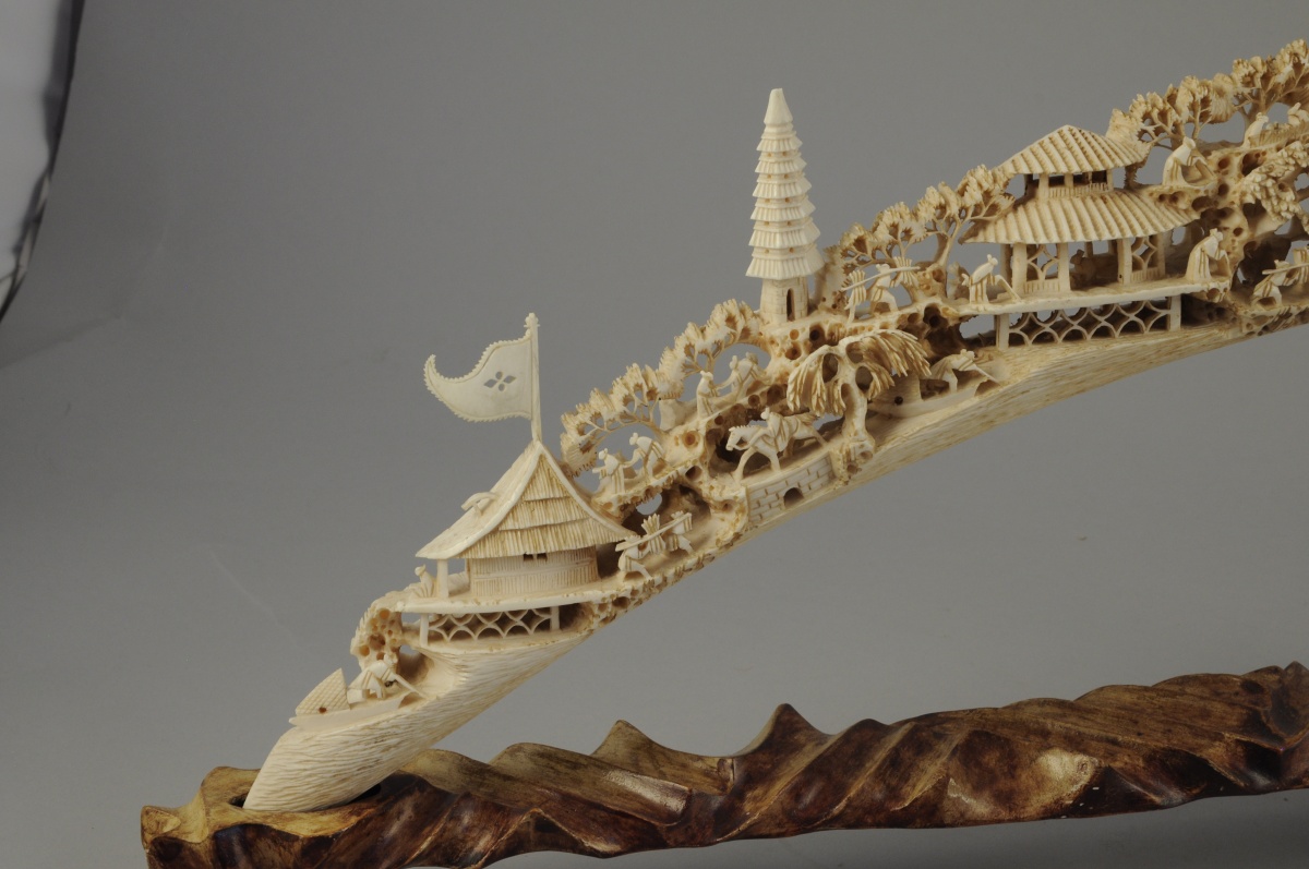 DÉFENSE D'ÉLEPHANT en ivoire finement sculptée et travaillée de pagodes, personnages dans des paysages de montagne.