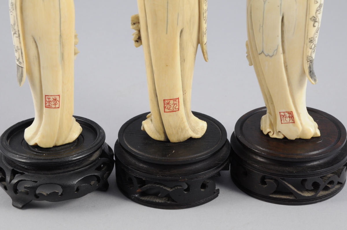 TROIS STATUETTES en ivoire sculpté figurant une femme tenant une fleur à la main. Signées.