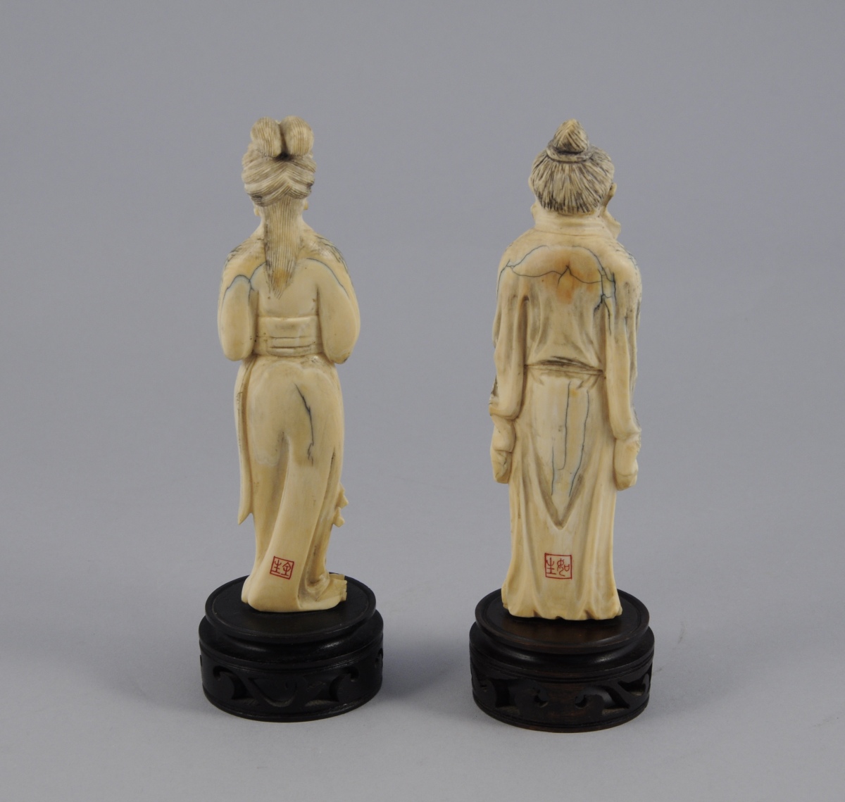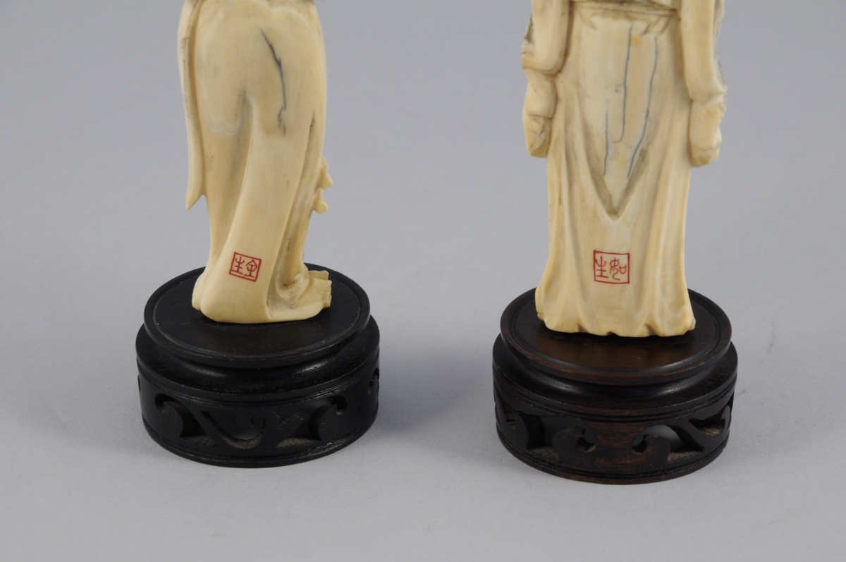 DEUX STATUETTES en ivoire sculpté. L'une figure un vieillard tenant une pêche de longévité de la main gauche; l'autre une femme tenant une fleur. Signées.