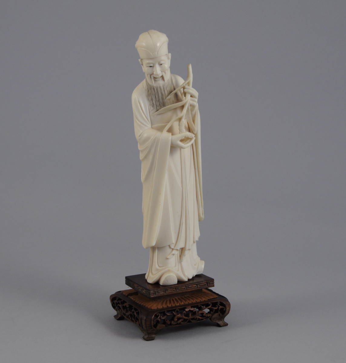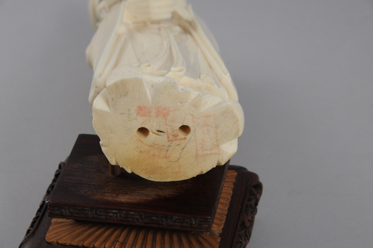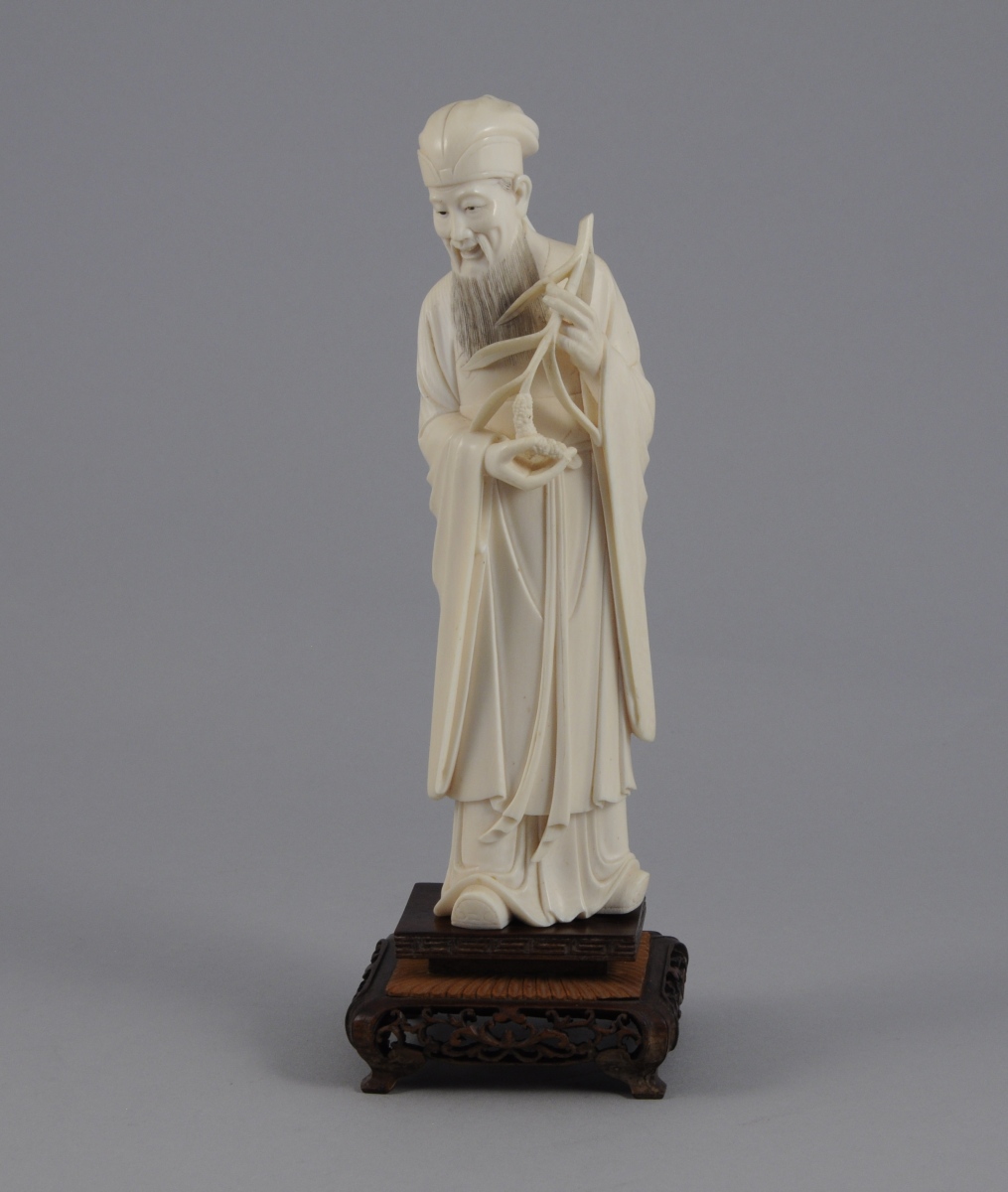 STATUETTE en ivoire sculpté figurant un vieillard tenant entre les mains une plante. Présente des cachets à l'encre rouge.